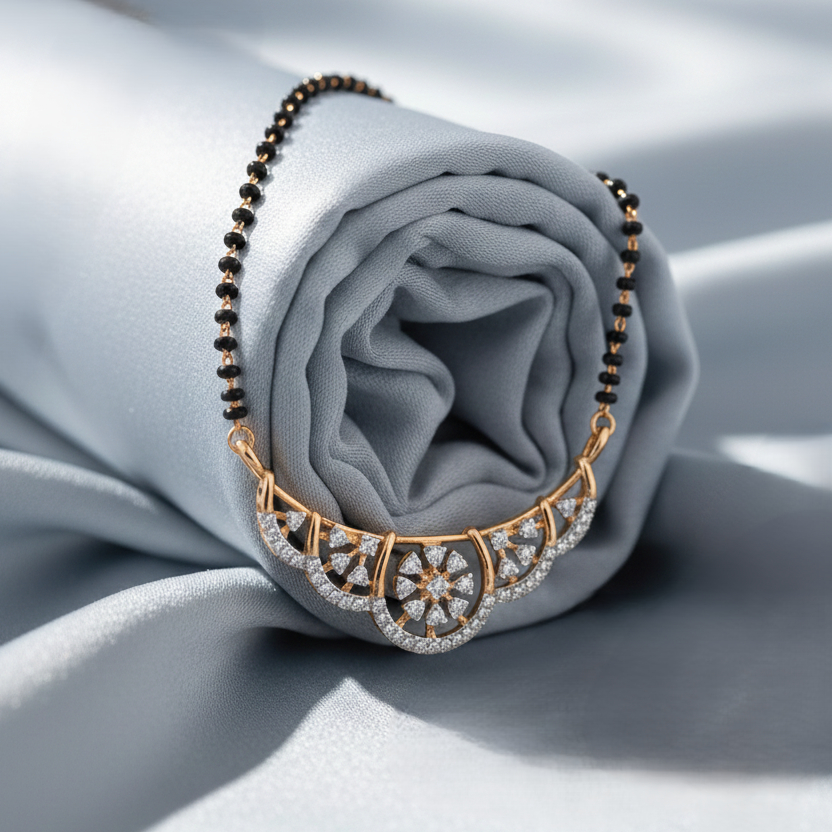 A magnificent mangalsutra featuring intricate diamond floral filigree patterns with a radiant centerpiece, symbolizing prosperity and everlasting love. The perfect harmony of traditional black beads and luxurious design makes this Tanmaniya a regal adornment for every special occasion.