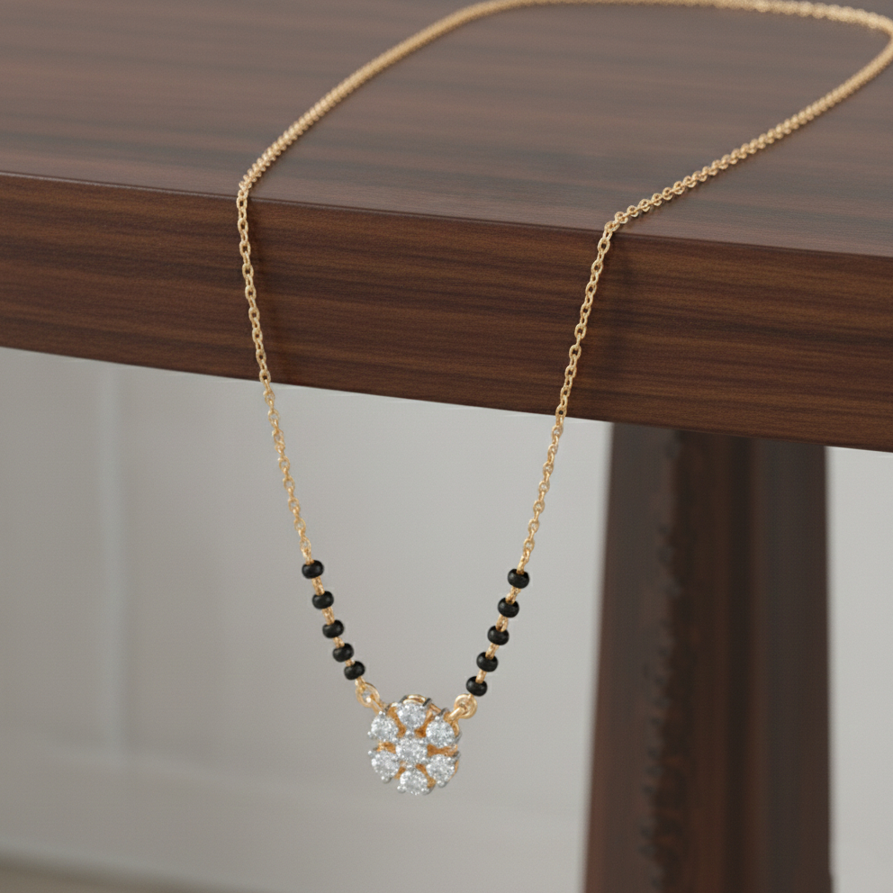 This elegant mangalsutra features a stunning, intricately designed pendant adorned with sparkling diamonds, set on a classic black beaded chain. A beautiful blend of tradition and modern style, it offers both protective symbolism and timeless charm for daily wear or special occasions.