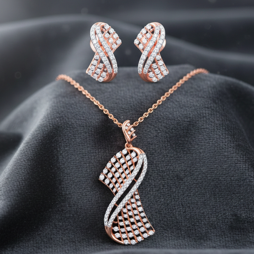 Modern rose gold pendant featuring a dynamic twisted design embellished with sparkling diamonds, perfectly matched with stylish earrings. Please note: Chain is not included – pendant only.