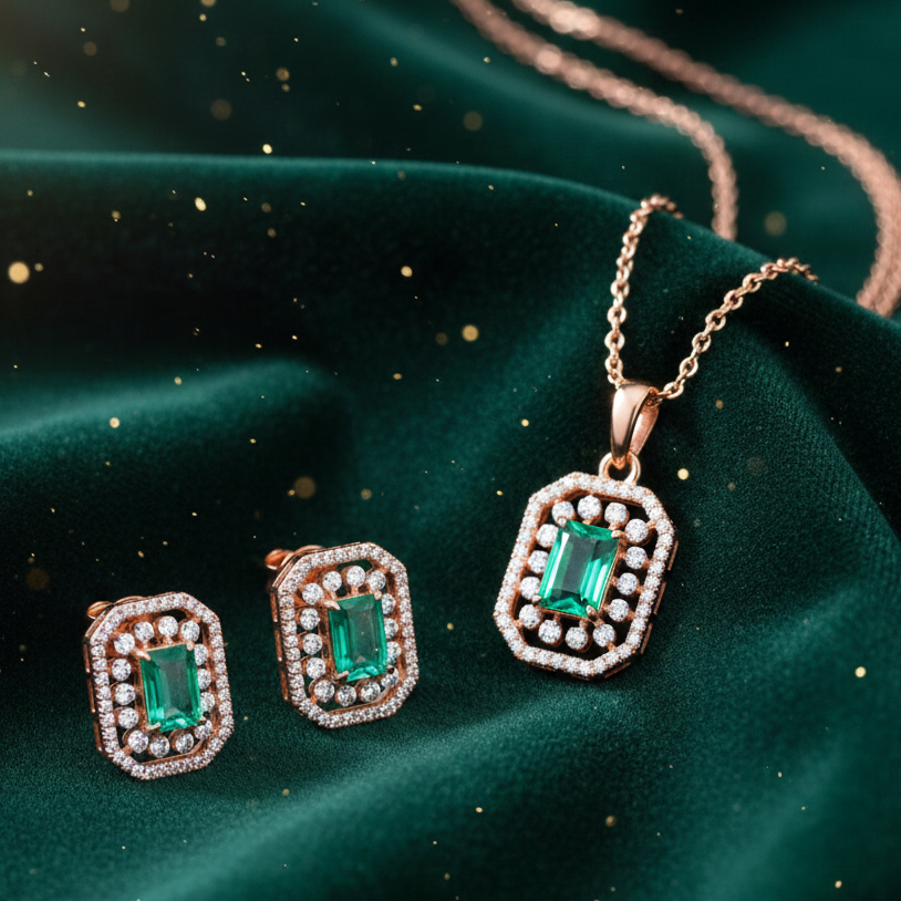 Make a grand statement with this diamond pendant set, featuring a bold rectangular green stone surrounded by sparkling diamonds in an elegant gold frame. Paired with matching earrings, this set is perfect for festive occasions and regal looks. Please note: Chain not included – pendant only.
