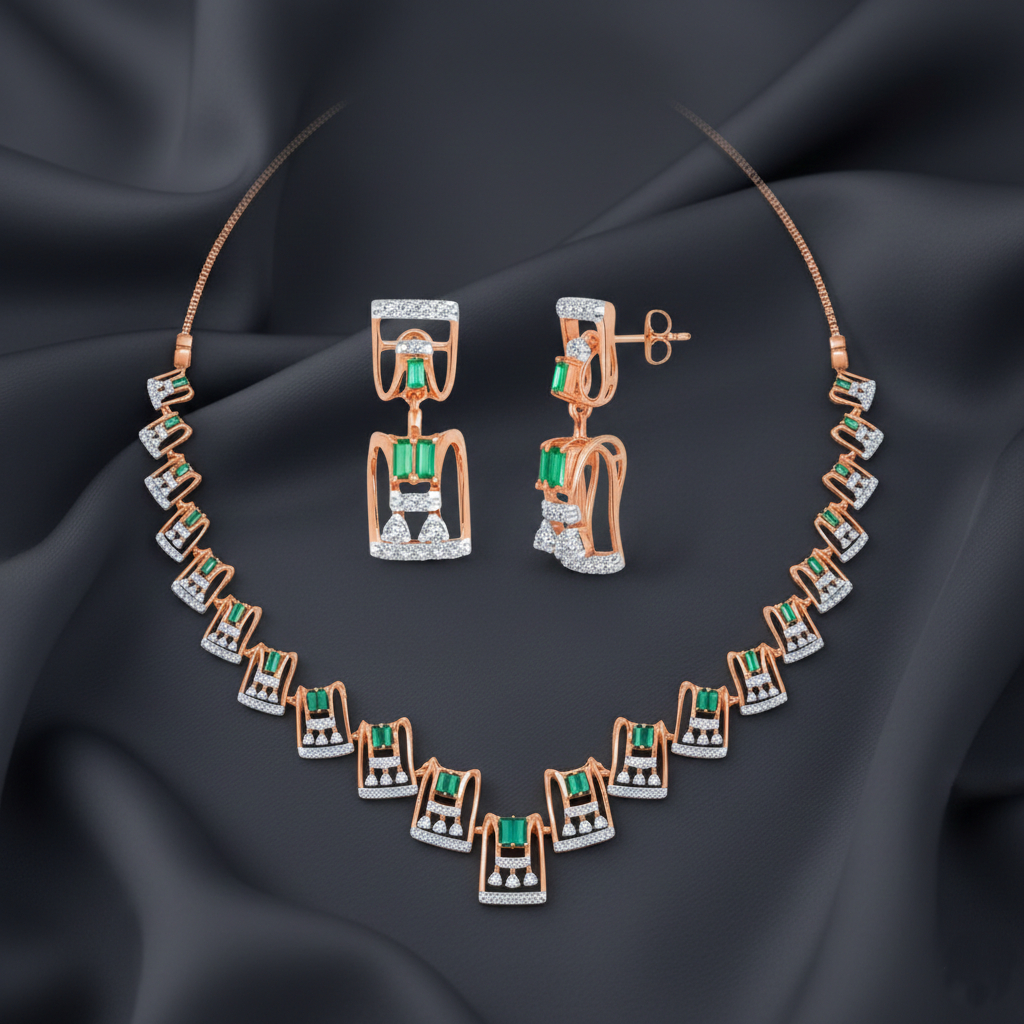 A luxurious necklace set showcasing square-cut synthetic emerald-green stones paired with shimmering diamonds, all aligned in a graceful zigzag rose-gold pattern. The matching earrings mirror the necklace’s bold design—perfect for weddings, festive occasions, and grand celebrations.