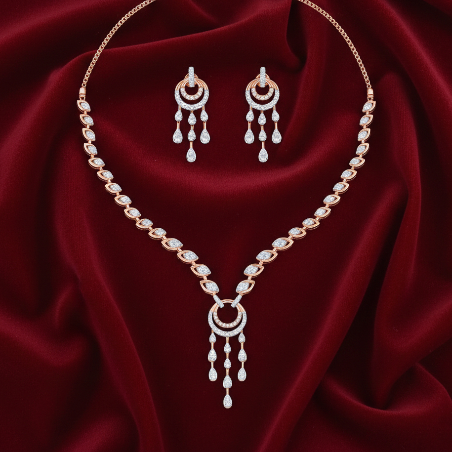 A delicate necklace set strung with shimmering diamonds, gracefully set in a symmetrical pattern along a fine gold base. Its sleek design exude a subtle charm, making it a perfect accessory for both elegant daytime looks and romantic evening outings.