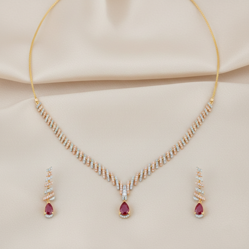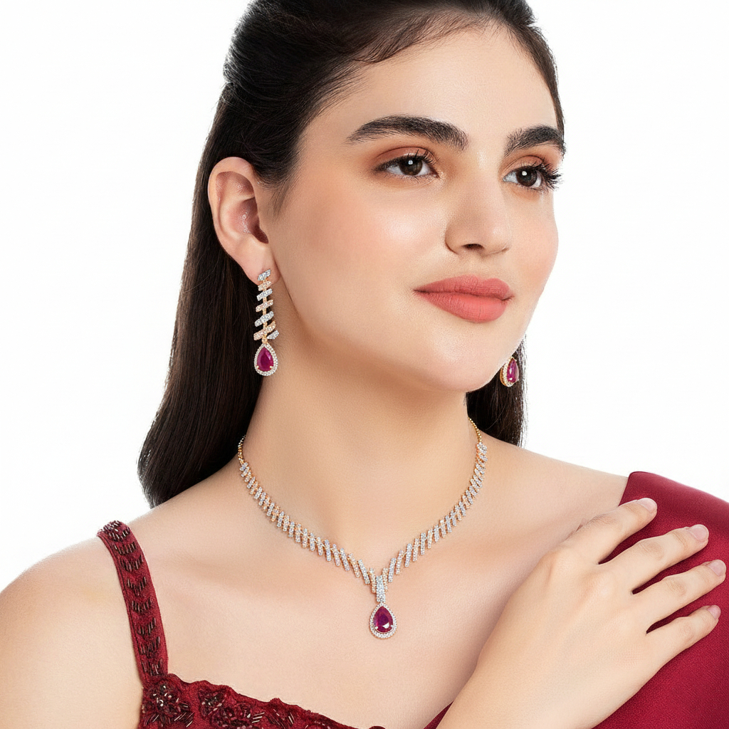 This elegant jewellery set features a delicate diamond-studded necklace with a captivating pear-shaped synthetic ruby centerpiece, complemented by matching drop earrings. Perfect for adding a touch of sophisticated glamour to any occasion.