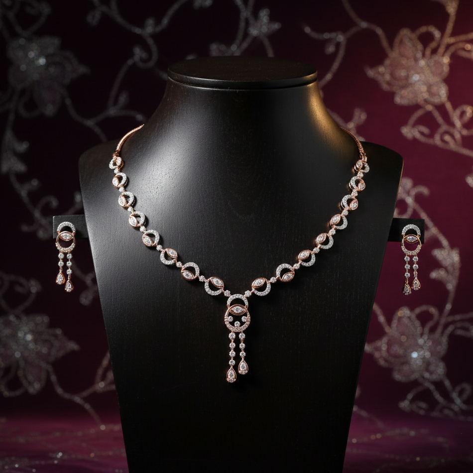 This exquisite set features a delicate rose gold and diamond necklace with captivating eye-shaped motifs and a central drop pendant, perfectly complemented by matching dangle earrings. It embodies elegance and grace for any special occasion.
