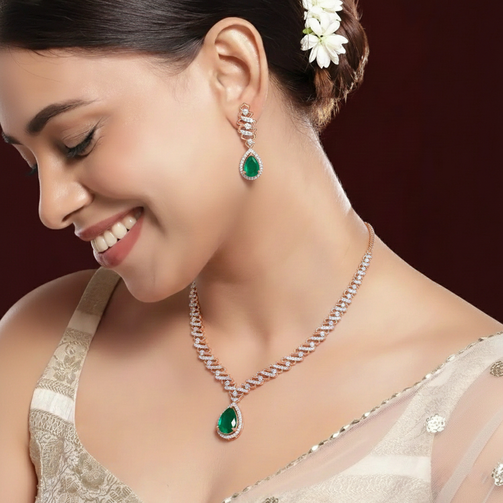 A regal necklace set adorned with lush green synthetic emerald drops and intricate dual-toned detailing. The symmetrical pattern adds grandeur, while the matching earrings enhance its rich appeal. Perfect for festive occasions or elegant evenings, this set radiates timeless luxury.