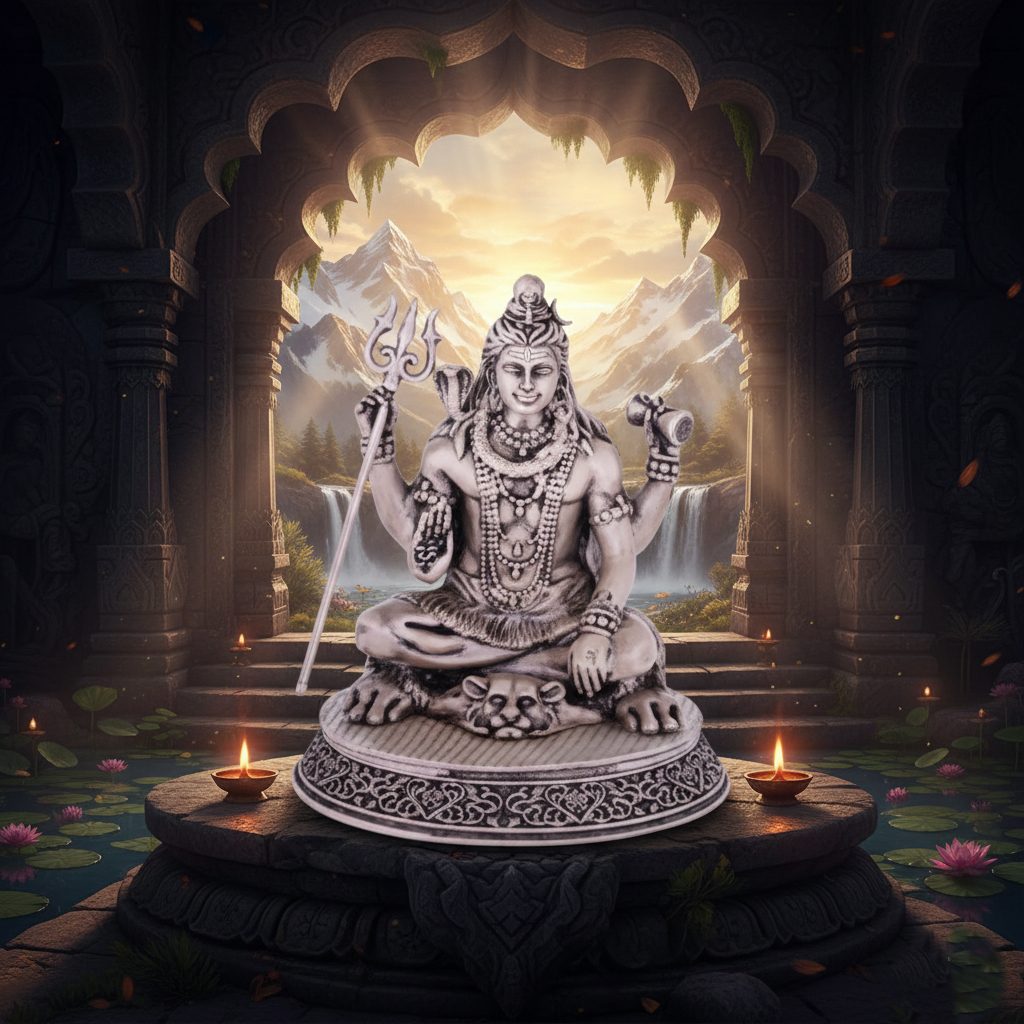 This idol of Lord Shiva is made in oxidized silver finish, depicting him in a meditative seated pose. Holding a trishul, damaru with rudraksha malas, a serpent and the crescent moon, it radiates divine energy. The lion face base and detailed craftsmanship reflect spiritual strength and grace.