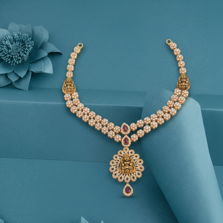 An opulent 22K gold necklace intricately set with rows of shimmering stones and accented by rich red gemstones. The centerpiece features a traditional embossed gold motif, seamlessly blending classic craftsmanship with contemporary elegance — perfect for weddings, festive occasions.