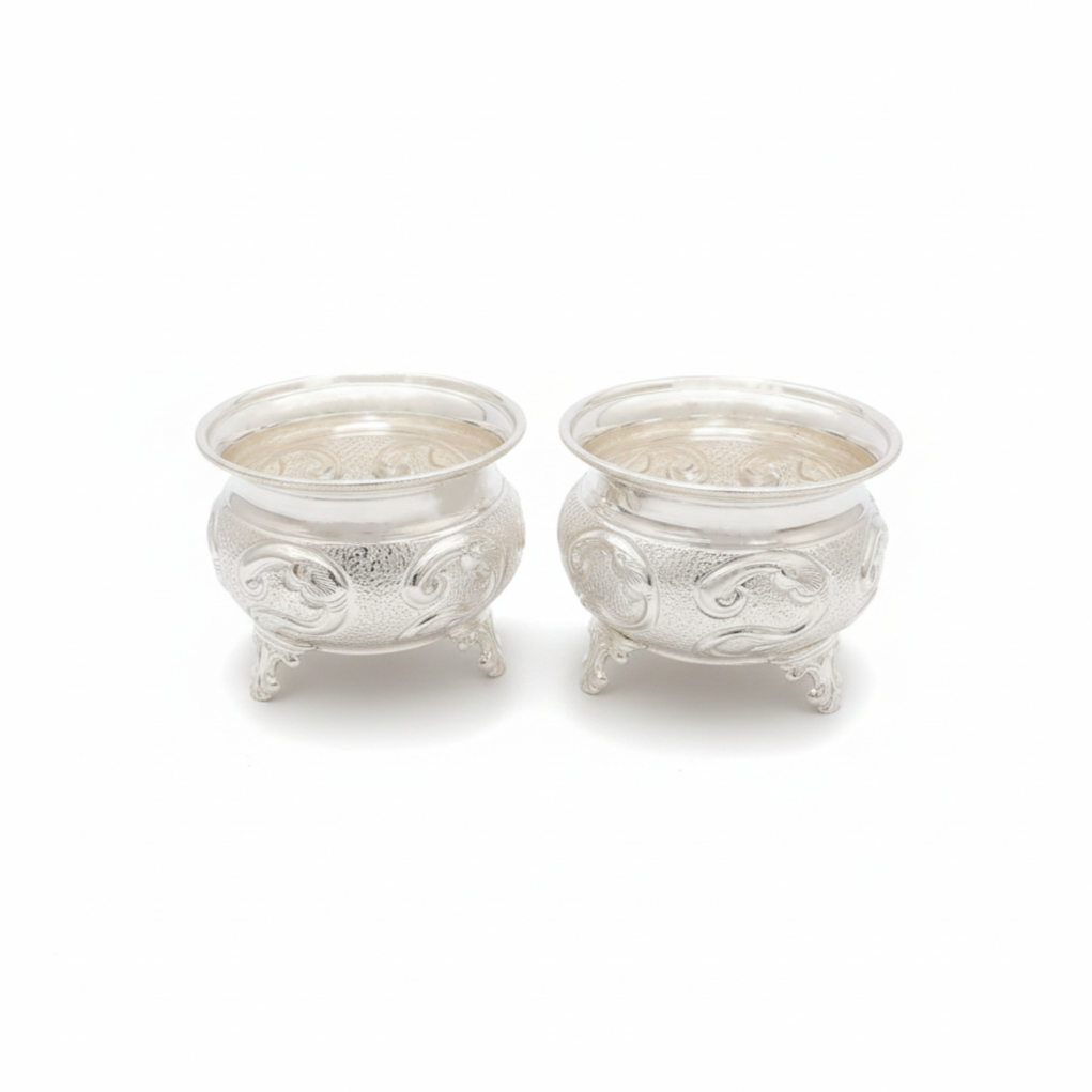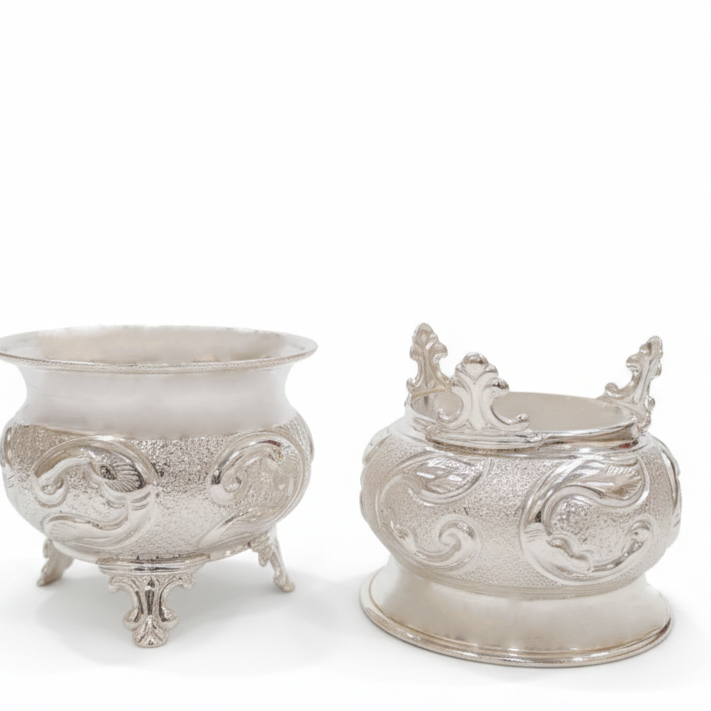 A matched set of ornate silver-finished containers, featuring intricate embossing and elegant tripod feet. Ideal for holding sacred powders like kumkum and haldi, these jars blend traditional craftsmanship with a touch of grace for your puja altar.