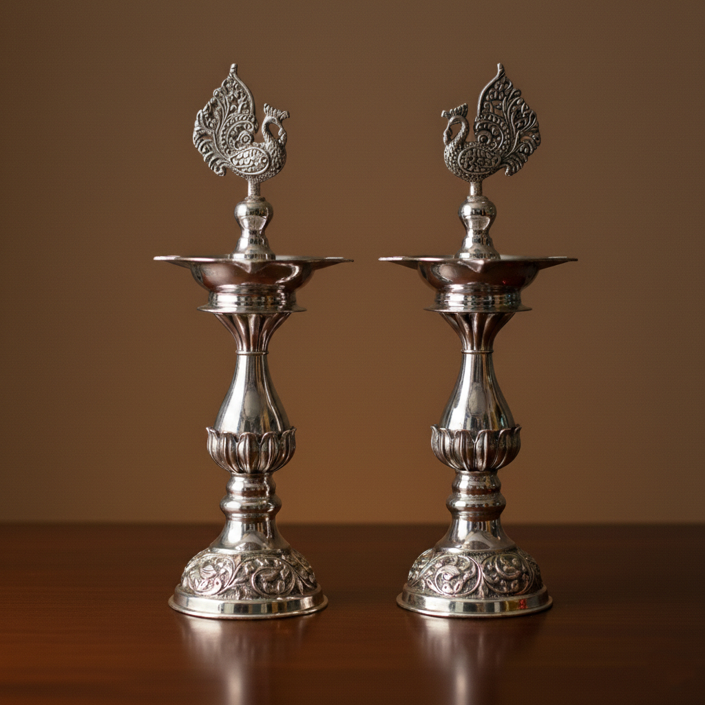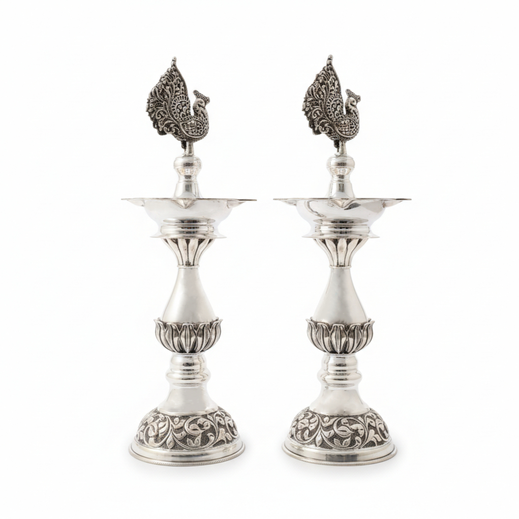 This exquisite pair of silver-finished lamps features intricate floral engravings and regal peacock toppers. Perfect for sacred rituals or as a statement decor piece, these lamps bring a touch of traditional elegance and a divine glow to your home.