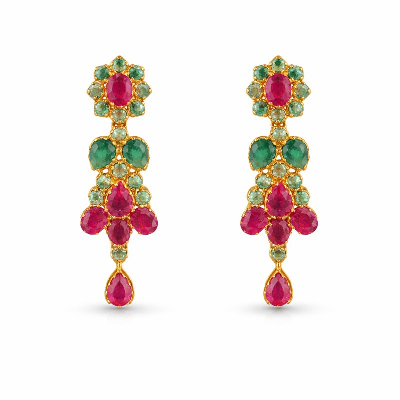 Exquisite gold-toned earrings adorned with lush green and crimson-hued stones arranged in a graceful floral pattern. Finished with a delicate dangling drop, this design brings festive charm, color, and timeless elegance to ethnic ensembles.