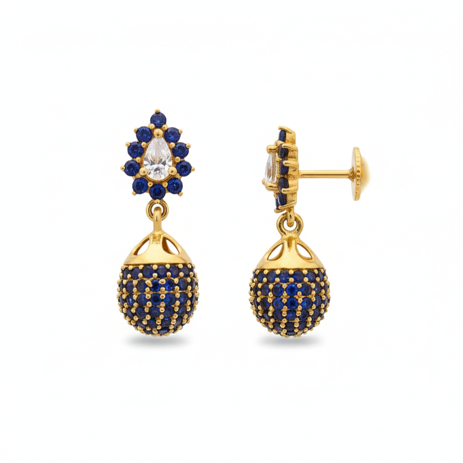 Graceful gold jhumka earrings adorned with deep blue stone detailing and a sparkling teardrop accent on top. The classic dome design paired with rich blue hues adds royal elegance, making these earrings perfect for festive celebrations and traditional attire.