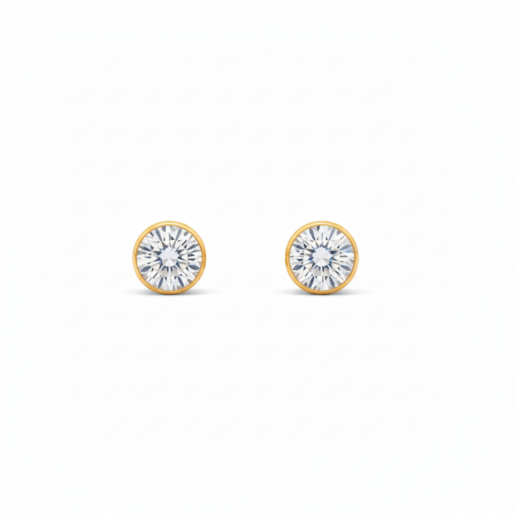 Elegant round stud earrings crafted in pure gold, featuring a brilliant crystal-like centerpiece encased in a smooth gold bezel. Minimal yet timeless, these studs add a refined sparkle to everyday wear and effortlessly complement both casual and festive looks
