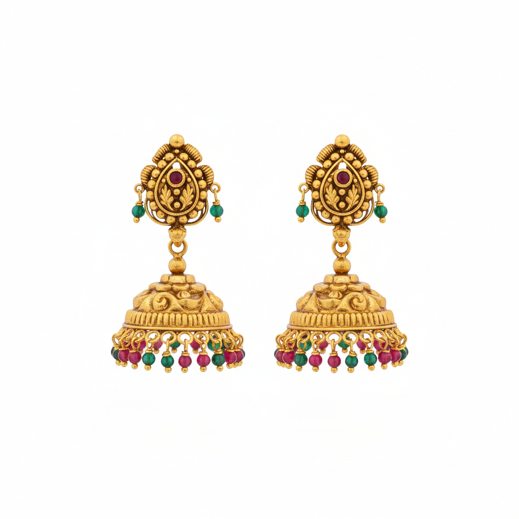 Graceful temple-style gold jhumkas adorned with intricate carvings and vibrant bead drops. The colorful accents add a festive charm, making them perfect for weddings, celebrations, and elegant traditional outfits