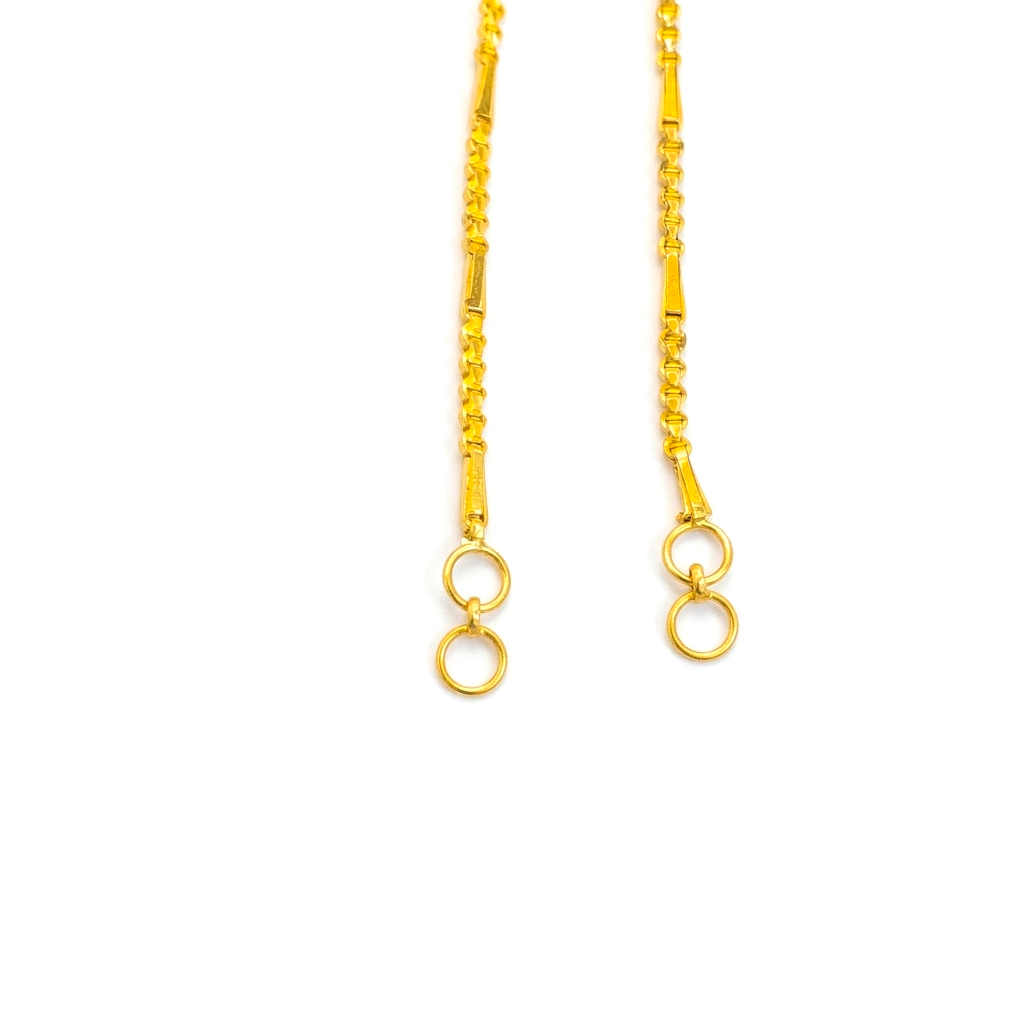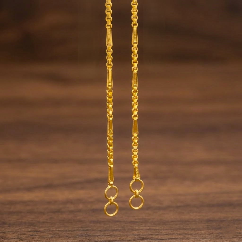 A beautifully crafted 22K gold mattal (ear chain) featuring delicate patterned links and elegant hanging loops. Designed to connect earrings gracefully to the hair or ear support, it adds a traditional yet refined touch to bridal and festive jewellery styling.