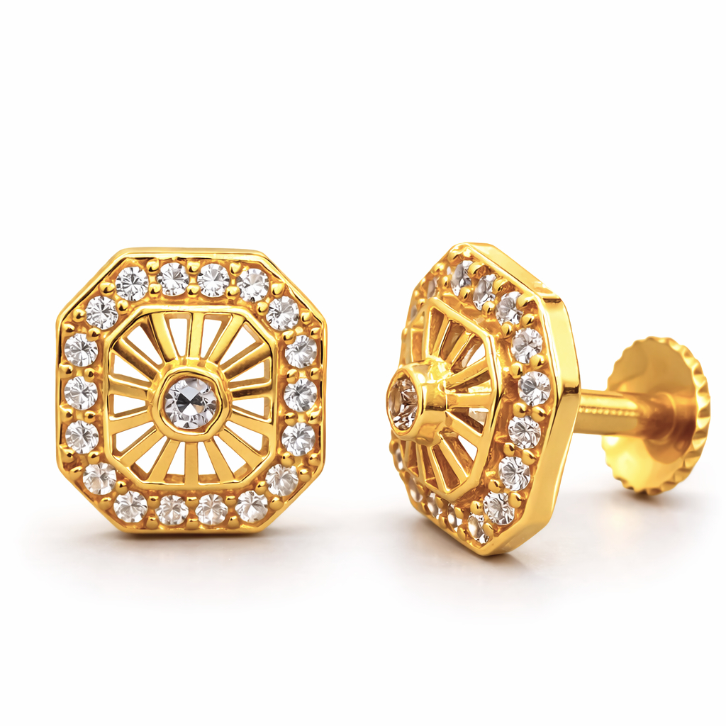 Elegant 22K (916) yellow gold tops featuring a beautifully faceted square design with a radiant sunburst center. The textured pattern reflects light from every angle, giving a rich sparkle while maintaining a classic and sophisticated everyday look.
