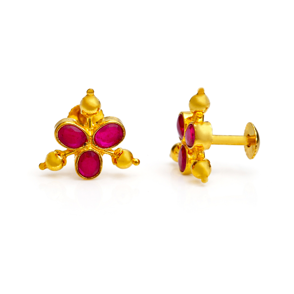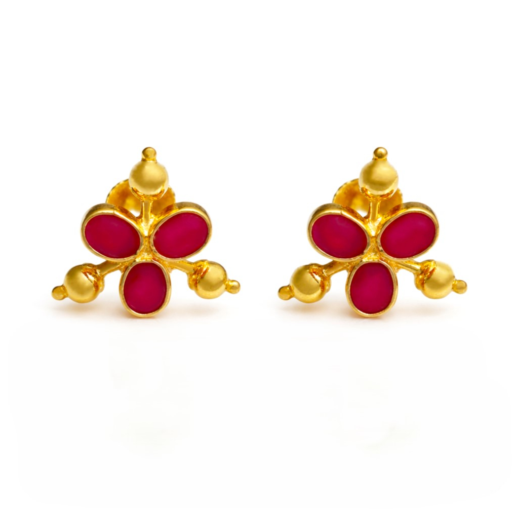 Graceful 22K gold tops featuring three radiant pink stones arranged in a floral-inspired design. The elegant gold detailing and compact shape give them a classic yet stylish appeal. Perfect for daily wear or festive outfits, these earrings add a soft pop of color and timeless charm.