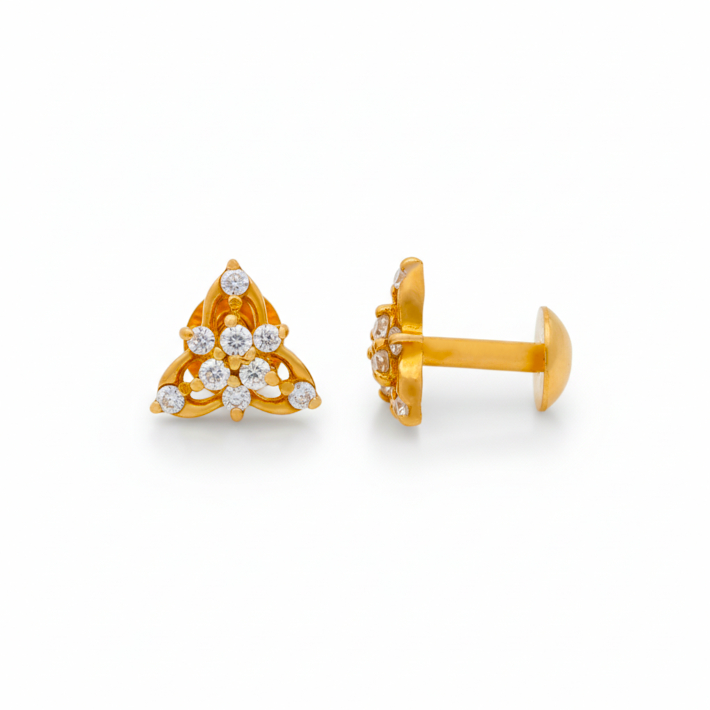 Delicate three-petal floral tops crafted in 22K gold with shimmering CZ stones. Their graceful triangular bloom design adds a subtle sparkle, making them perfect for daily elegance or festive charm. Lightweight, classy, and timeless.