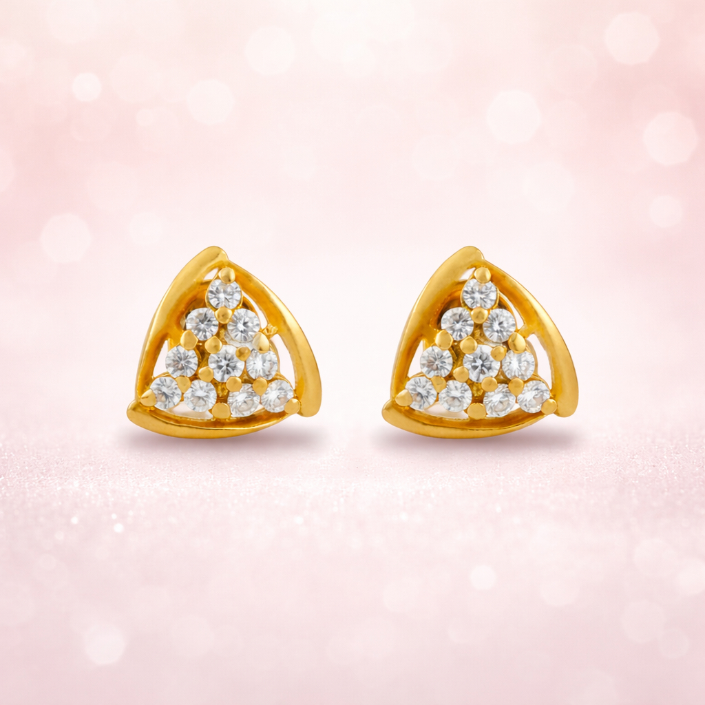 A graceful triangular design crafted in 22K gold (916 hallmark), studded with shimmering CZ stones. These elegant tops reflect light beautifully, adding a delicate sparkle to your everyday and festive looks. Perfect for minimal yet classy styling.