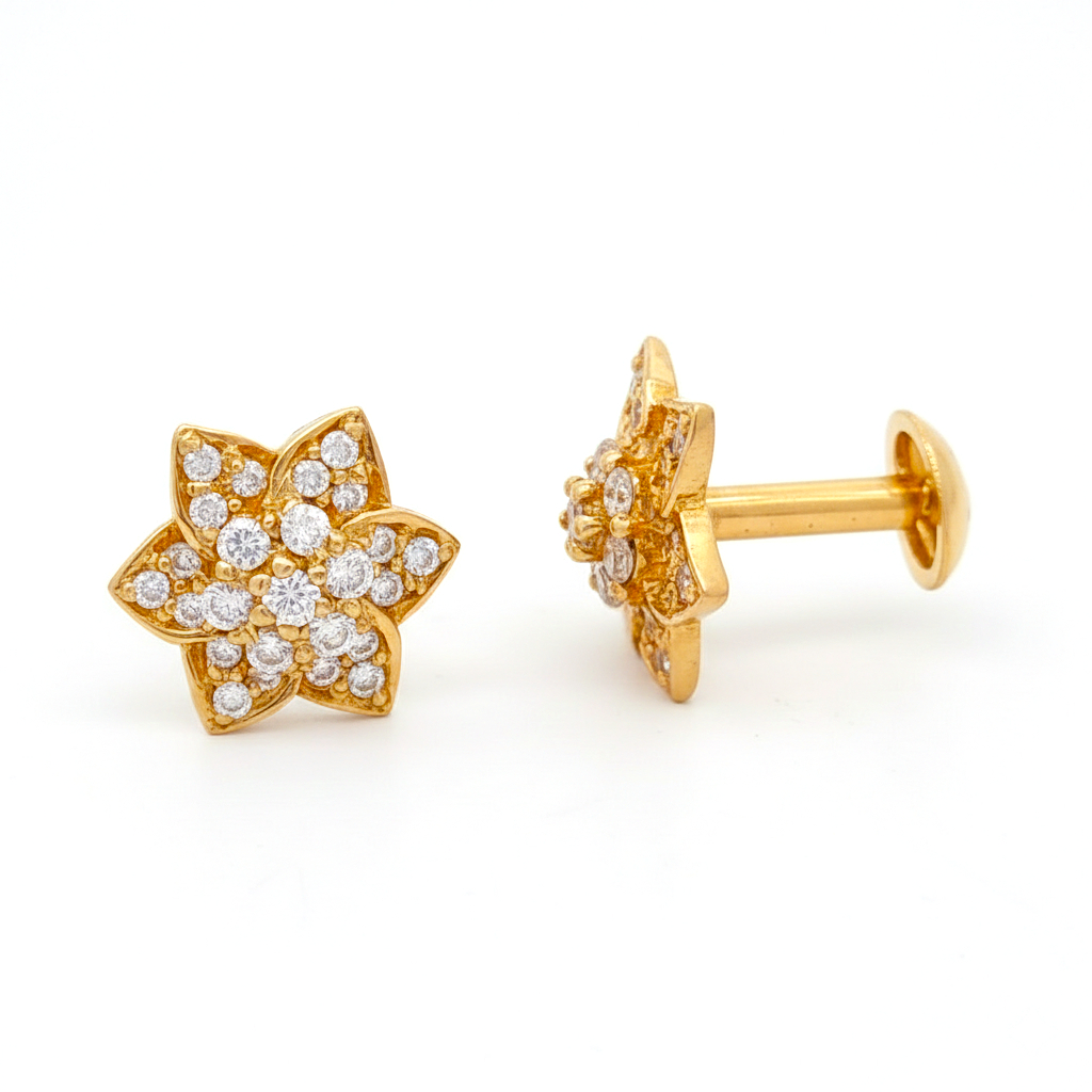 A pair of 22K (916) Hallmark gold earrings featuring a dainty six-petal floral design. Each petal is meticulously encrusted with Cubic Zirconia, offering a sophisticated, understated sparkle for a timeless look.