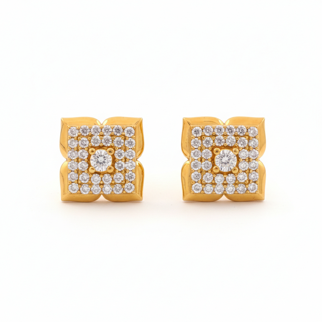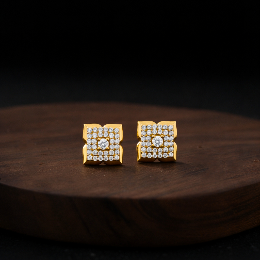 Elegant 22K gold square studs adorned with dazzling CZ stones in a layered geometric design. The bold yet refined structure adds a royal touch, making them perfect for festive wear, weddings, or classy everyday glam. A timeless sparkle that elevates every look.