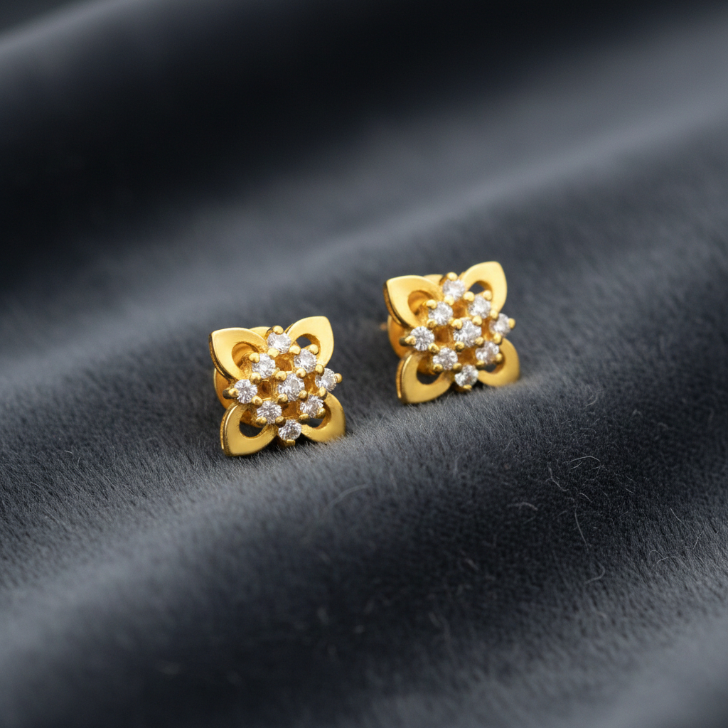 Delicate 22K gold CZ tops crafted in a charming four-petal floral design. Sparkling stones at the center add a graceful shimmer, making them perfect for daily elegance or festive moments. Lightweight, classy, and beautifully radiant.