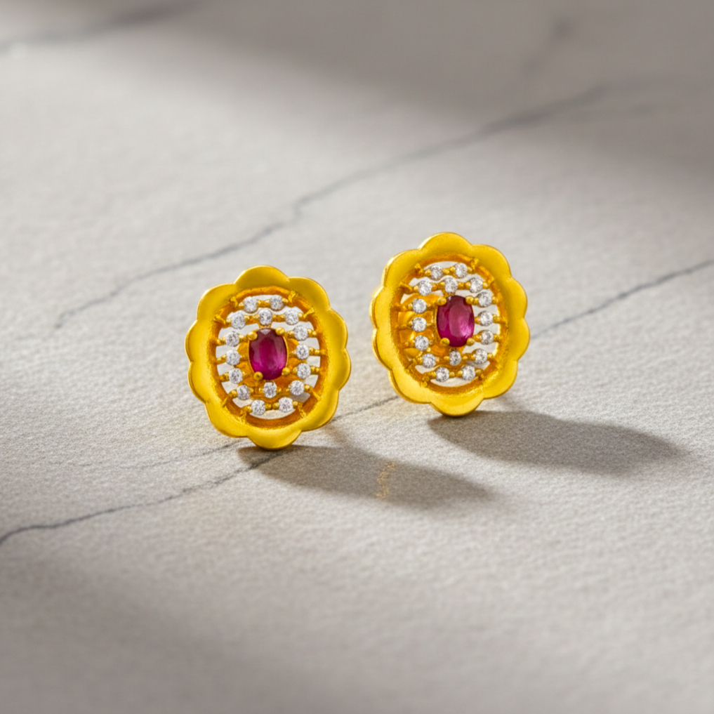 Elegant 22K gold CZ tops designed in a delicate floral pattern, featuring a vibrant ruby-toned center stone encircled by sparkling white stones. Perfect for daily wear or festive occasions, these lightweight earrings add a graceful shine and timeless charm to every look