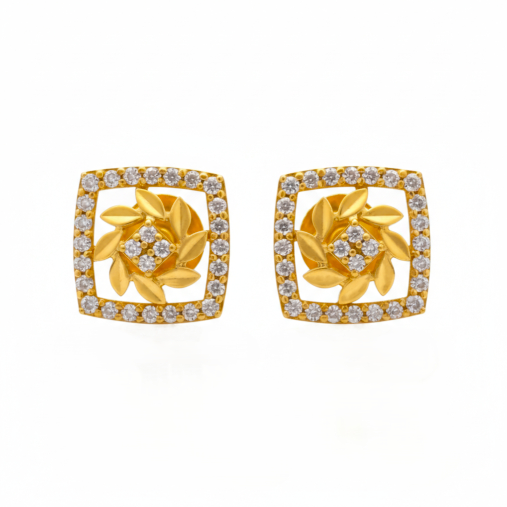 Chic 22K gold square tops featuring a delicate leaf motif at the center, framed with sparkling CZ stones. The elegant geometric design blends nature-inspired beauty with modern charm, making them perfect for daily wear, office style, or festive elegance.