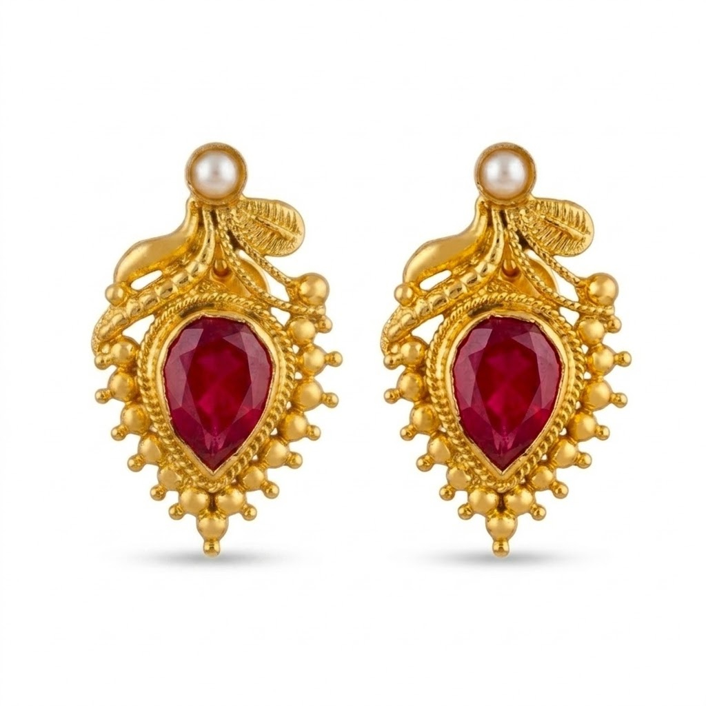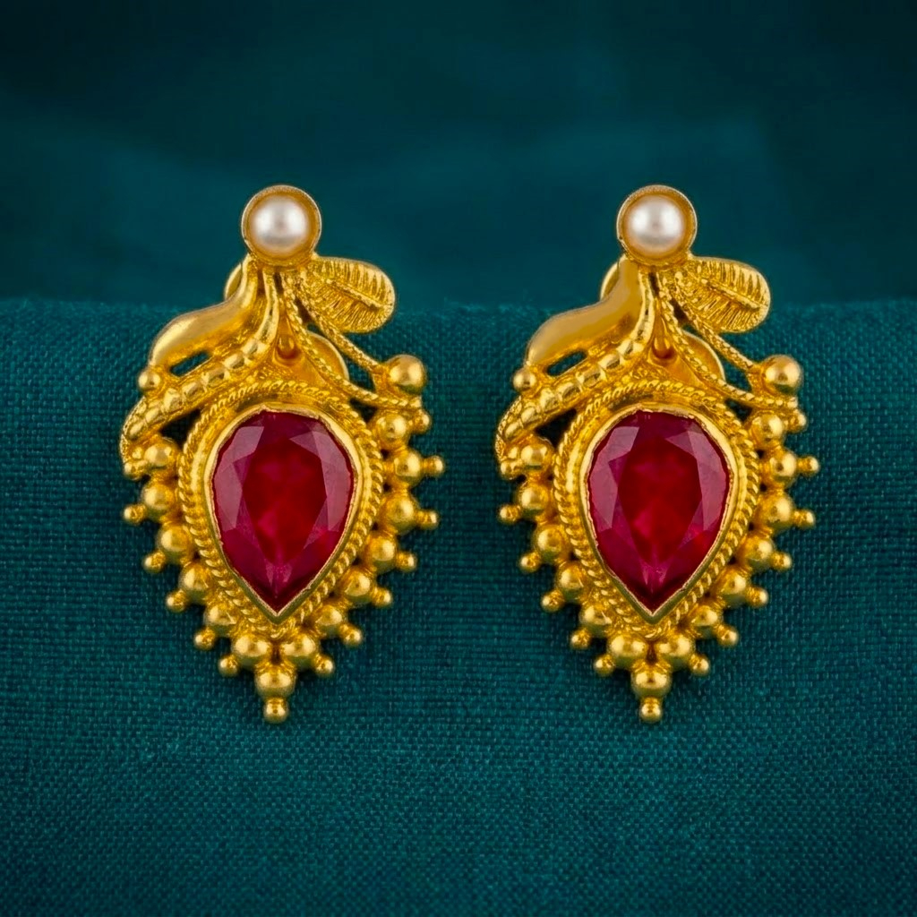 These vintage-style earrings are crafted in 22KT yellow gold and showcase a soft teardrop-shaped pink gemstone at the center. Detailed filigree work, fine gold bead accents along the edges, and a delicate pearl on top add a graceful, timeless charm.