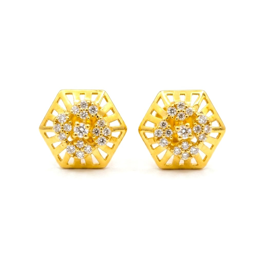 Crafted in 22K (916) hallmarked gold, these hexagon-shaped tops feature a delicate openwork frame with a sparkling CZ floral cluster at the center. The intricate design blends geometric elegance with soft brilliance, making them perfect for both daily wear and special occasions.