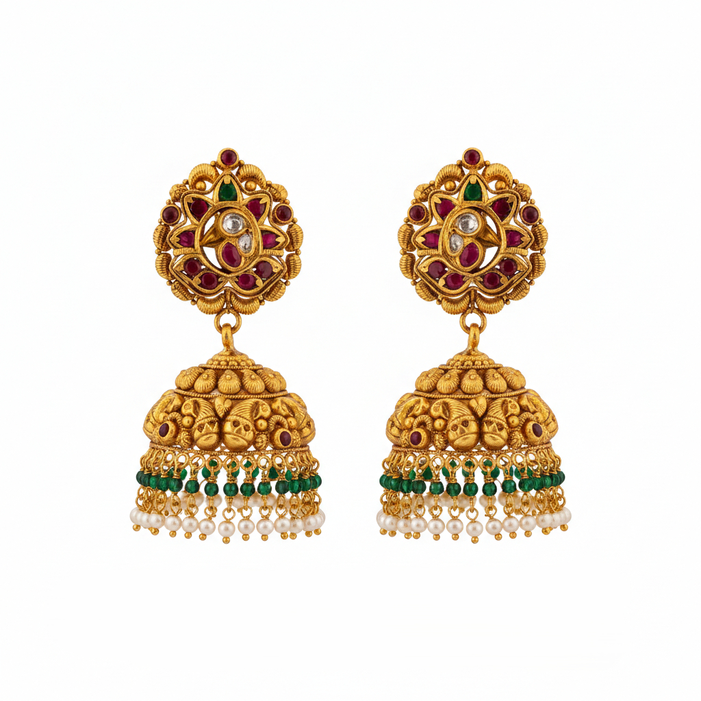 Beautifully handcrafted gold jhumkas featuring intricate navratna-style detailing on the stud, paired with a richly textured dome and graceful green bead drops. A perfect blend of tradition and luxury, ideal for weddings, festive celebrations, and heirloom-inspired looks.