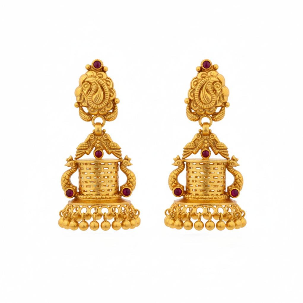 Inspired by timeless temple artistry, these handcrafted gold jhumkas feature intricate motifs, rich detailing, and delicate hanging beads. A perfect blend of tradition and elegance, ideal for weddings, festivals, and classic ethnic looks