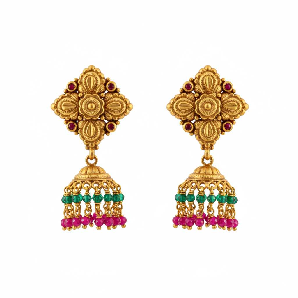 Crafted in a classic temple style, these gold jhumkas feature a floral stud with intricate detailing, paired with a graceful dome. Finished with vibrant green and pink bead drops, they bring timeless charm—perfect for festive wear, weddings, and traditional ensembles.