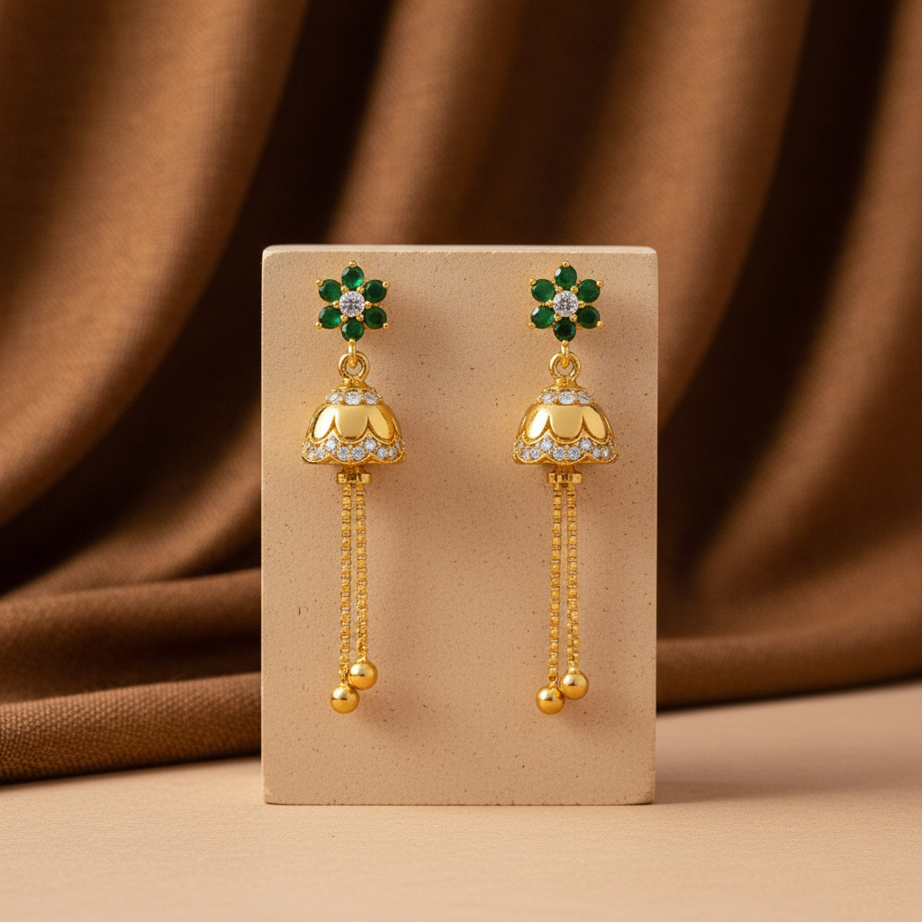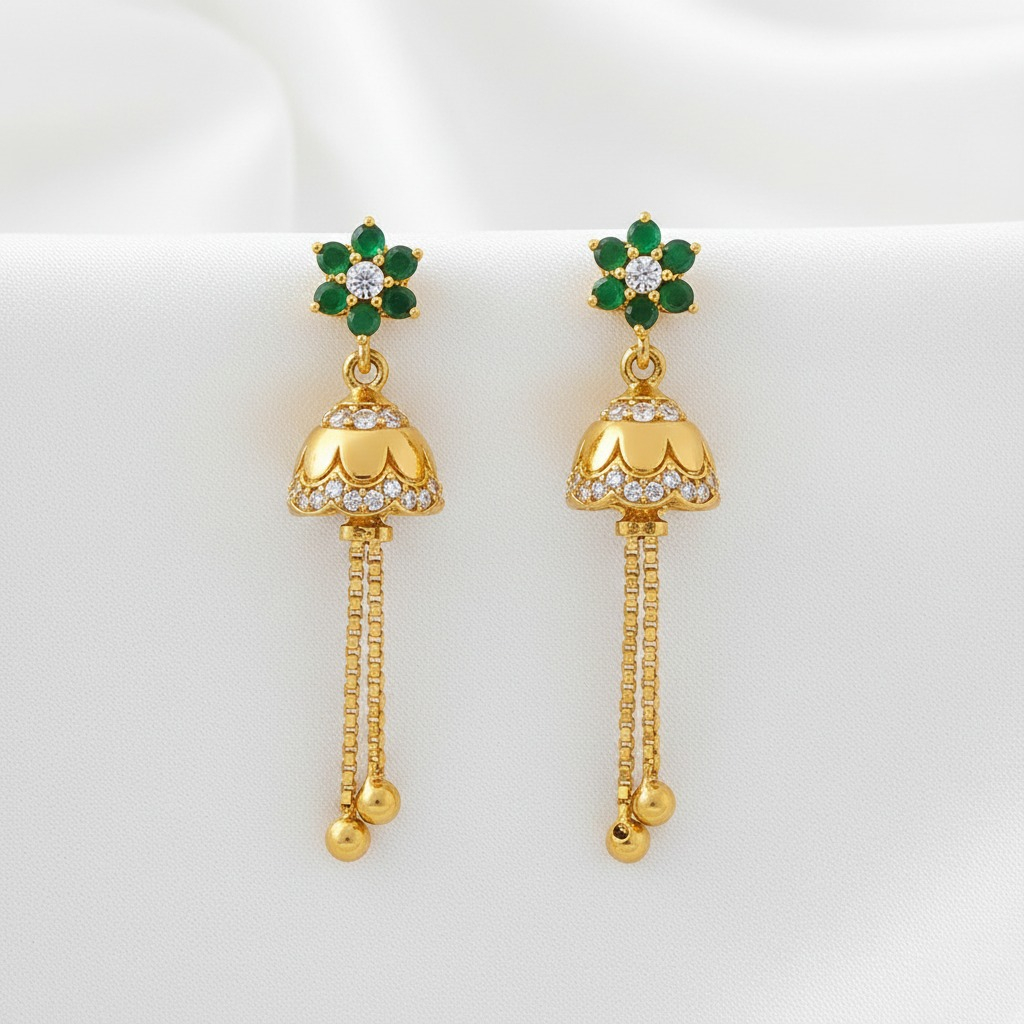 Delicate gold-tone jhumki earrings featuring a charming green floral stud with a sparkling CZ center. Finished with a petite dome and graceful chain tassels, these earrings offer a perfect balance of traditional elegance and modern finesse for festive wear.