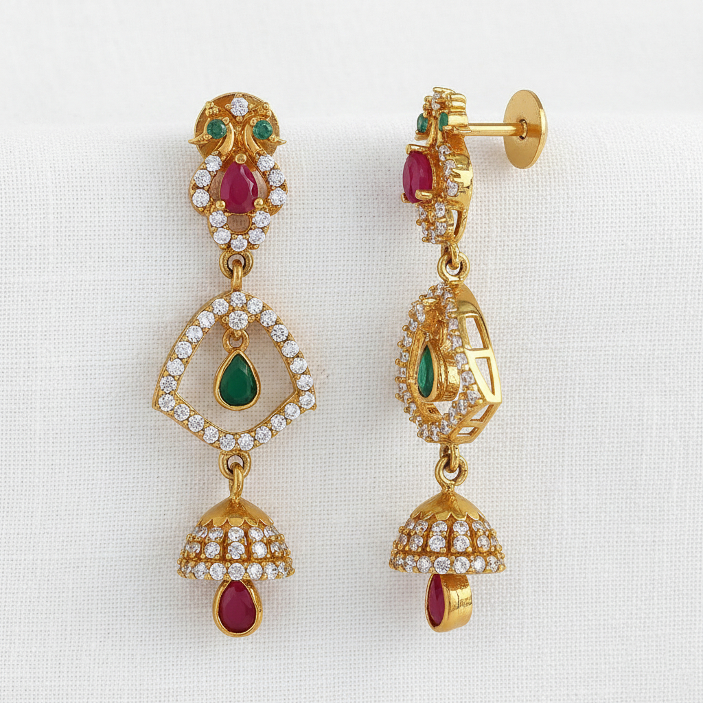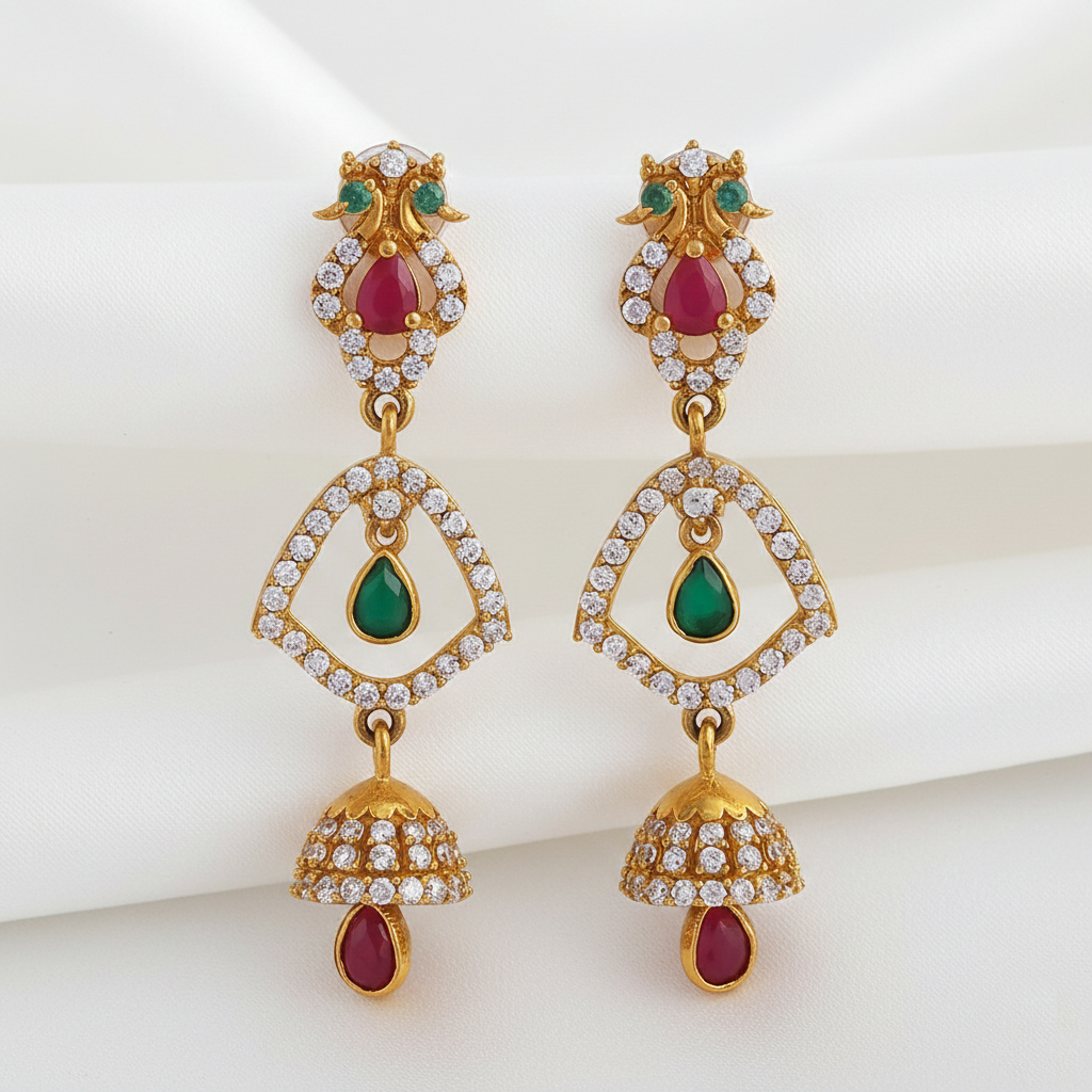 Elegant gold-tone drop earrings adorned with vibrant crimson, verdant, and pink-hued stones. Finished with a delicate jhumki silhouette, these earrings beautifully blend traditional charm and colorful grace for festive and wedding wear.