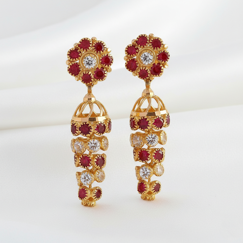 Exquisite gold-tone drop earrings featuring a floral crimson-studded top with a sparkling center. The layered jharokha-style danglers cascade with crimson and clear stones, creating a regal blend of traditional craftsmanship and graceful movement for festive occasions.