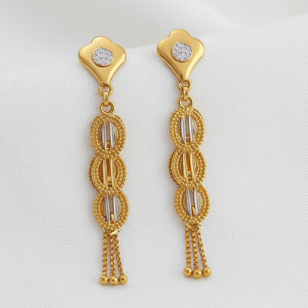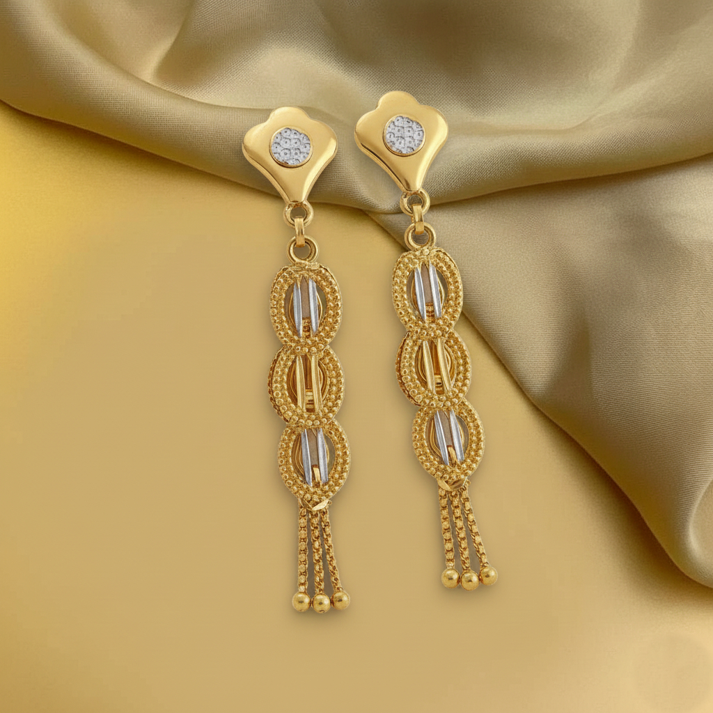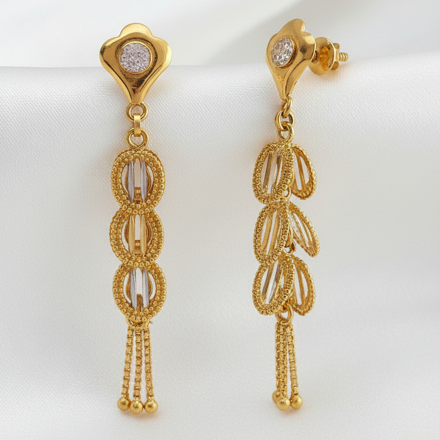 Elegant gold-tone drop earrings featuring a sleek stud top with a subtle sparkle, followed by layered oval motifs and delicate chain tassels. Designed to move gracefully, they add a refined touch of traditional charm and modern elegance to festive and evening wear