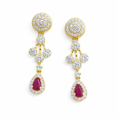 Exquisite gold-toned danglers adorned with sparkling CZ motifs and a rich crimson teardrop centerpiece. Designed to reflect royal elegance and timeless charm, perfect for weddings, festive occasions, and statement ethnic looks.
