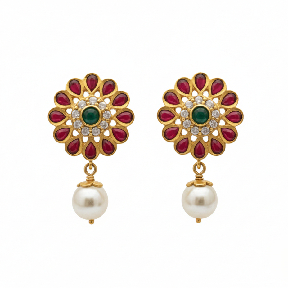 Elegant temple-style earrings crafted in an antique gold finish with intricate traditional detailing. Accented by subtle green and crimson tones, the design is beautifully completed with serene aqua bead drops, adding grace and charm to festive and ethnic attire.