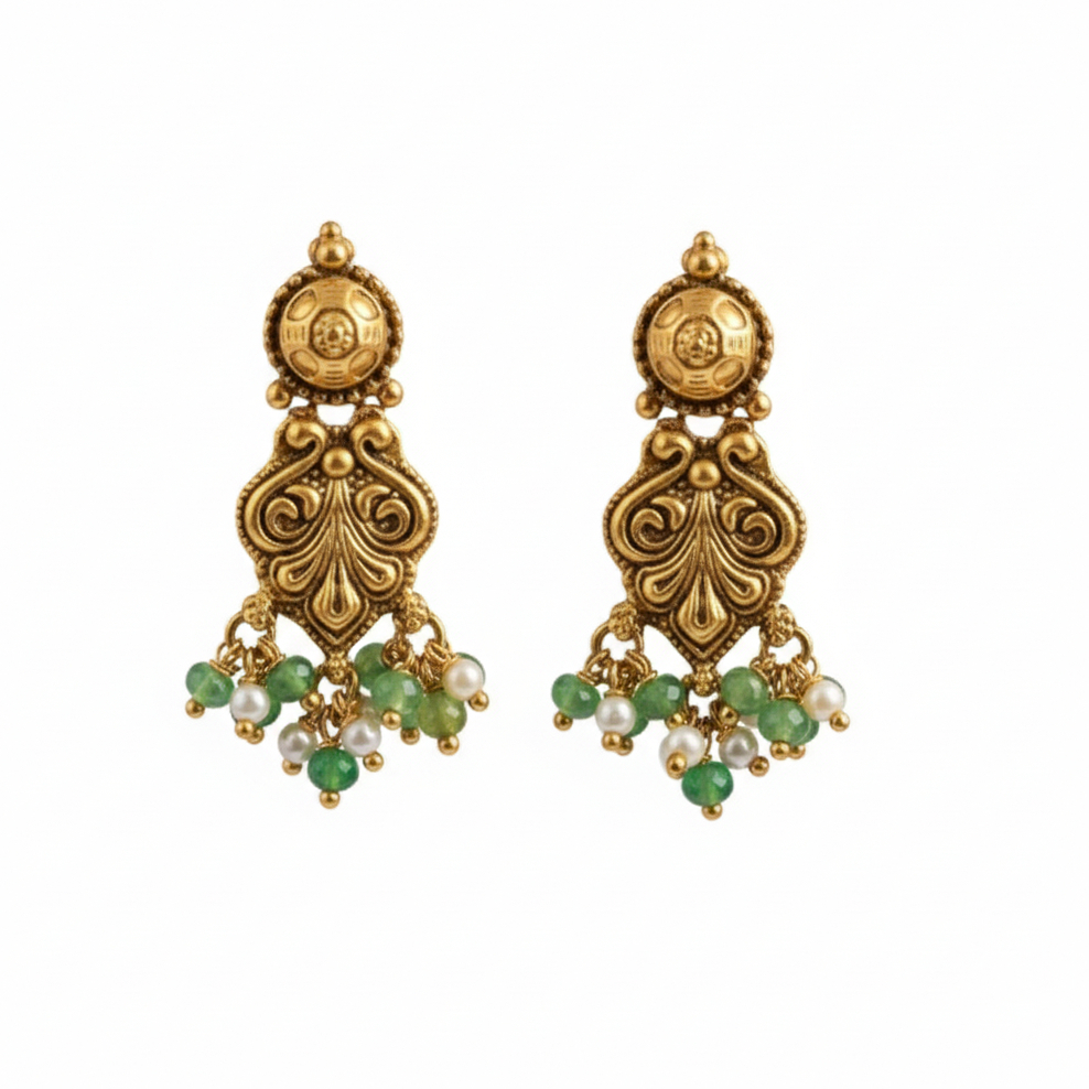 Inspired by classic temple jewellery, these ornate gold-tone earrings showcase detailed carvings paired with soothing green bead drops. Their elegant design and timeless appeal make them perfect for traditional celebrations and cultural occasions.