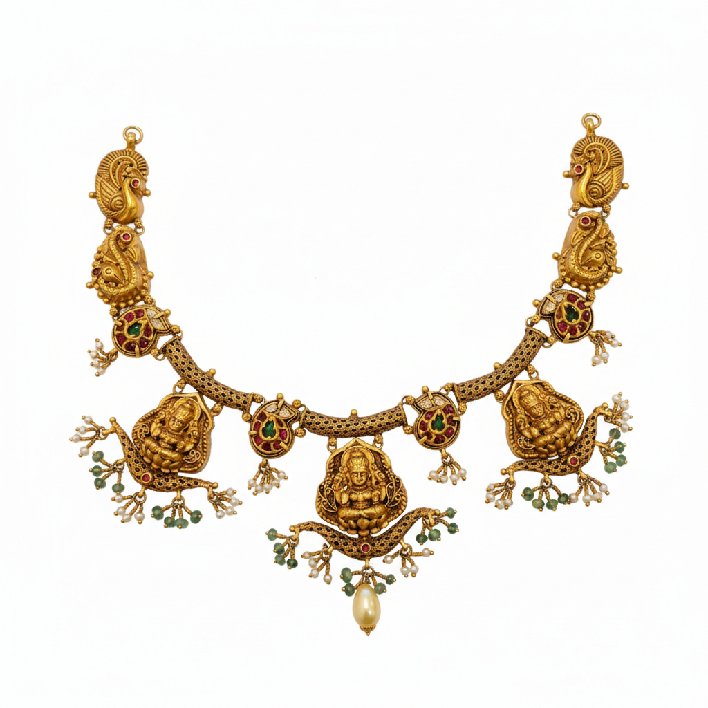 An exquisite temple-style gold haram adorned with intricate Goddess Lakshmi motifs, graceful peacock accents, and delicate hanging beads. A perfect blend of devotion and heritage craftsmanship, ideal for weddings, festivals, and traditional celebrations