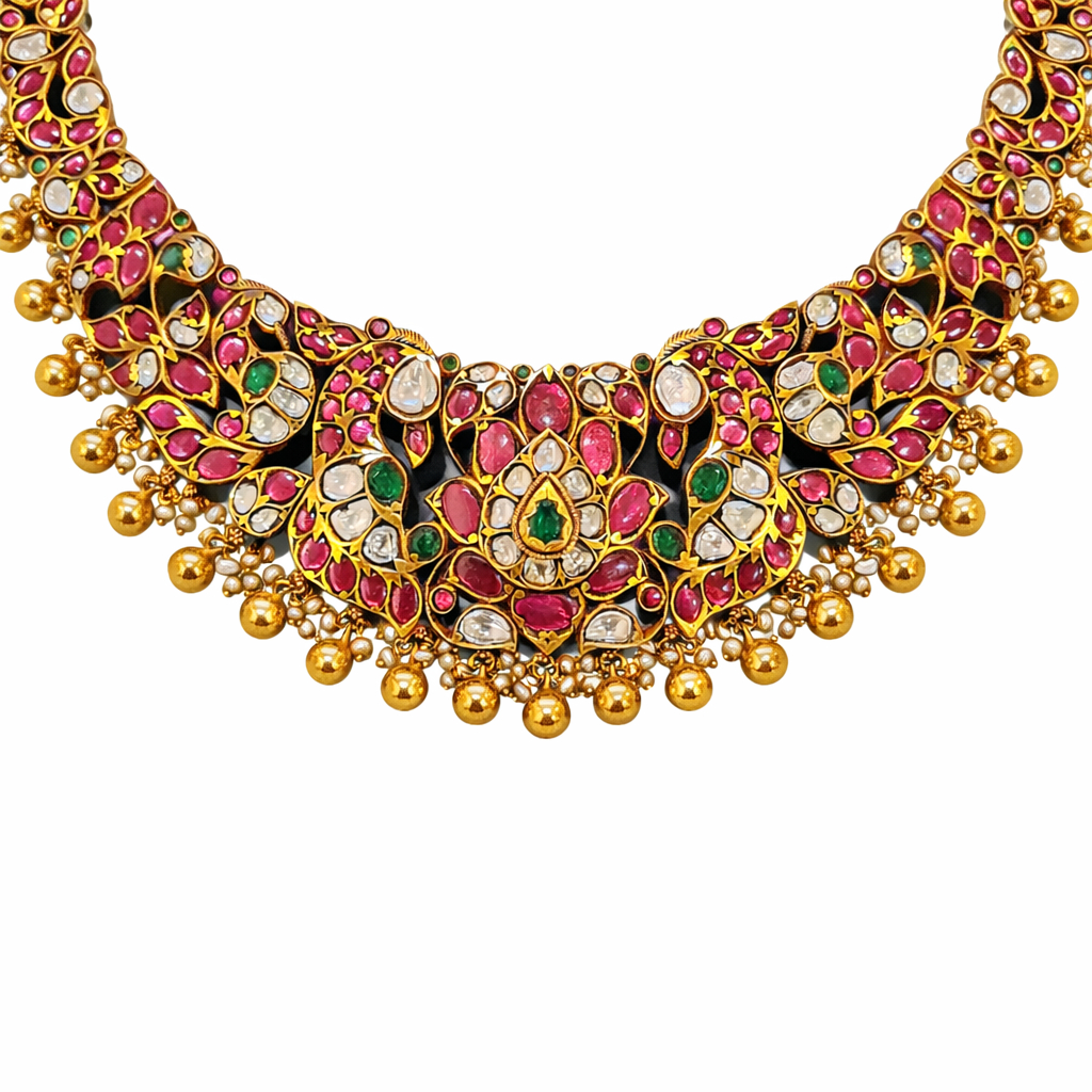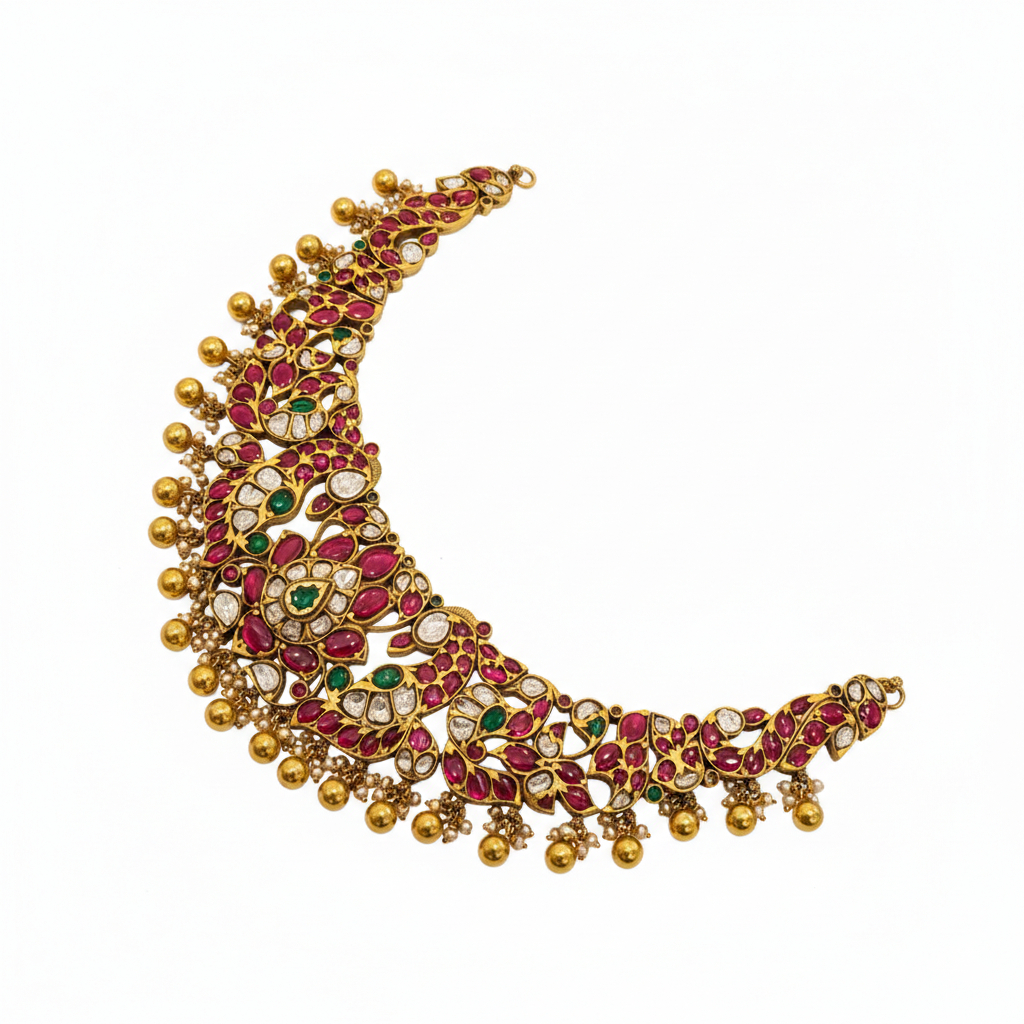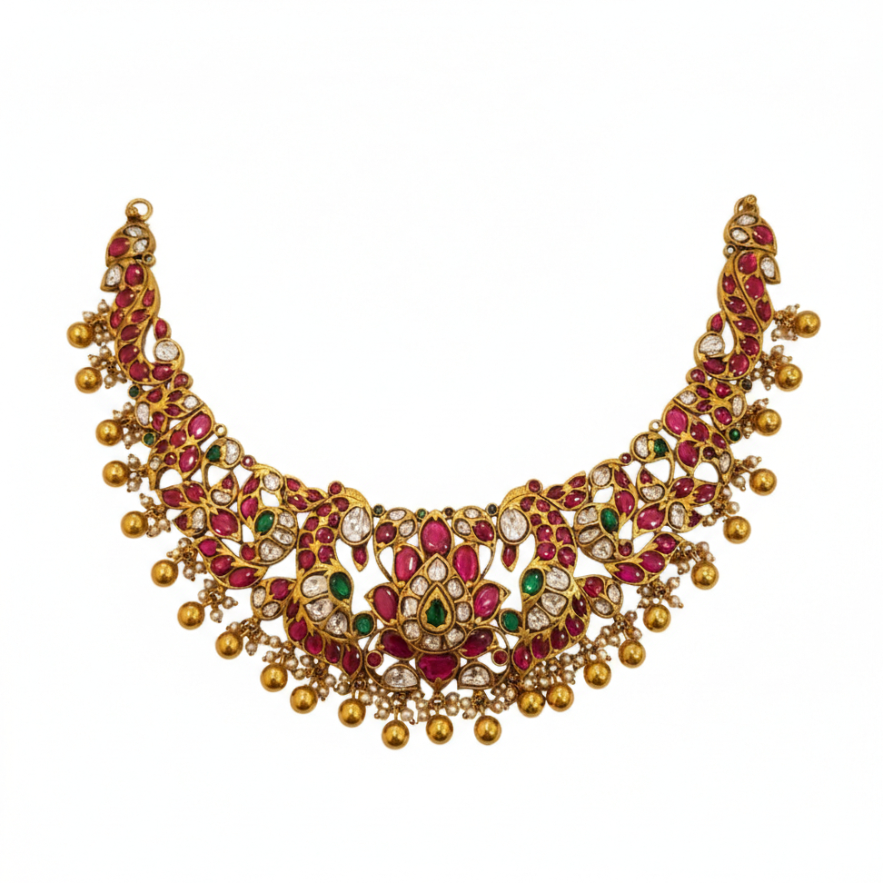 A regal temple-inspired choker crafted in intricate jaal work with luminous stone detailing and soft verdant accents. Finished with traditional gold ball danglers, this timeless piece reflects royal craftsmanship and is perfect for bridal, festive, and ceremonial wear.