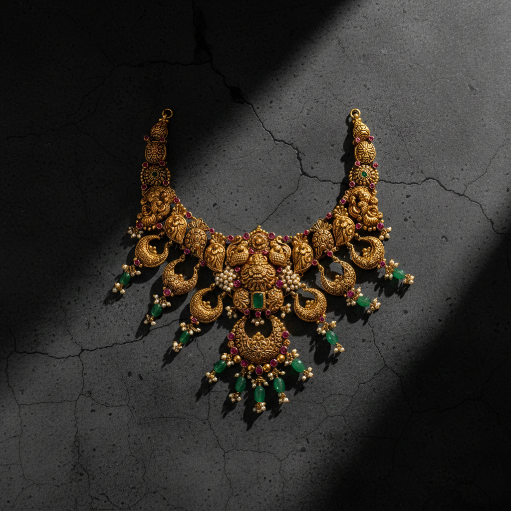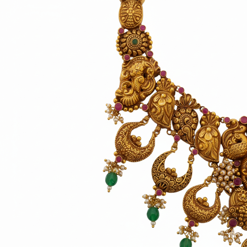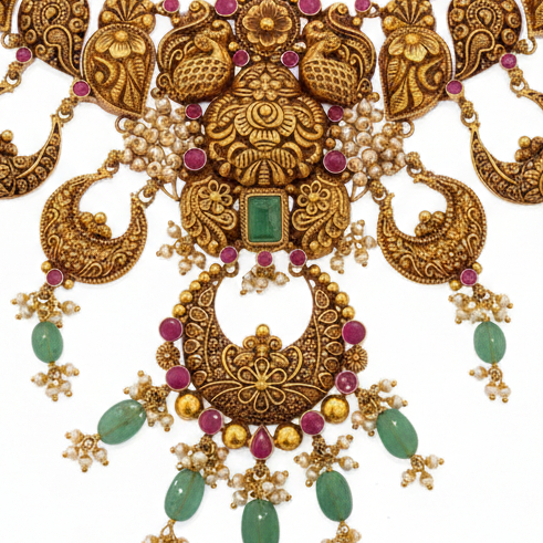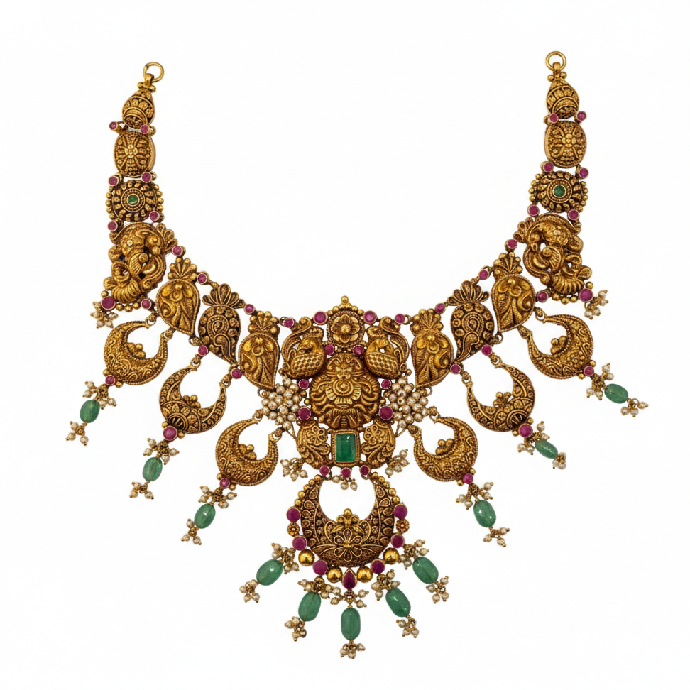 A majestic antique-style gold necklace adorned with intricate peacock and paisley motifs, ruby accents, and emerald green drops. Rich craftsmanship and temple-inspired detailing make it a stunning statement for weddings and grand festivities.