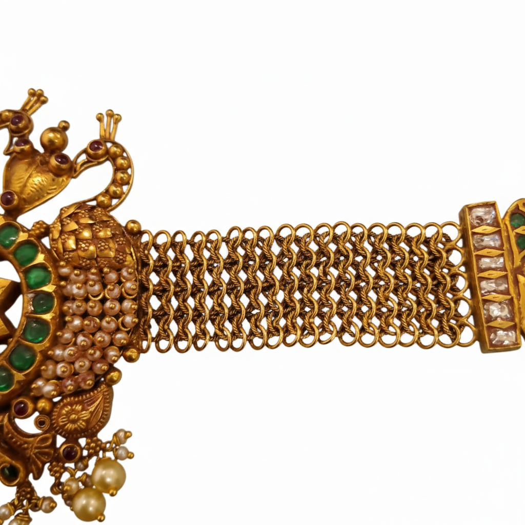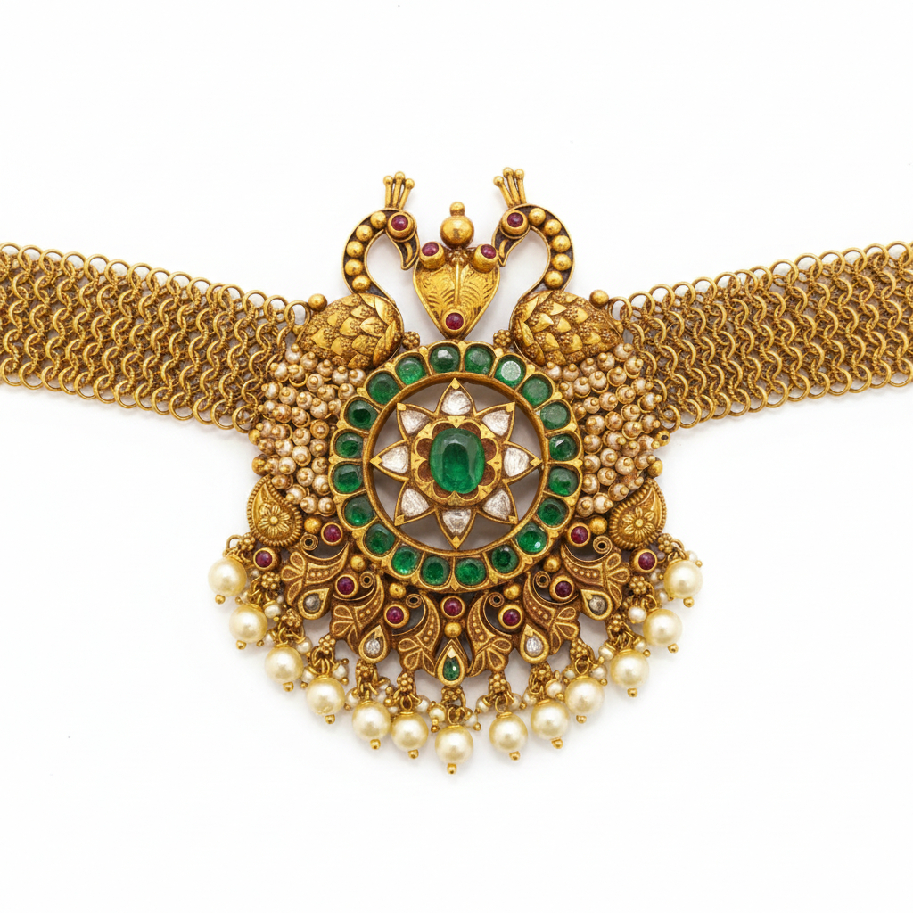 A regal temple-style gold necklace featuring twin peacock motifs embracing a radiant verdant centerpiece. Detailed beadwork, layered gold textures, and antique craftsmanship create a powerful statement piece ideal for weddings, rituals, and grand celebrations.