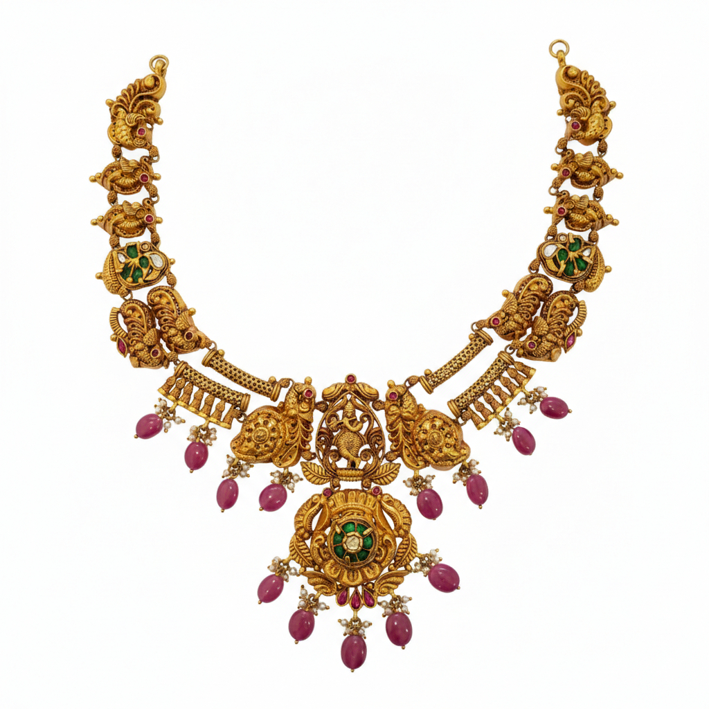 A beautifully crafted temple-style gold necklace featuring a detailed Krishna motif at the center. Designed with intricate carvings, pink stone drops, and subtle green accents, it reflects traditional charm and elegance. Perfect for weddings, festive occasions, and special celebrations.