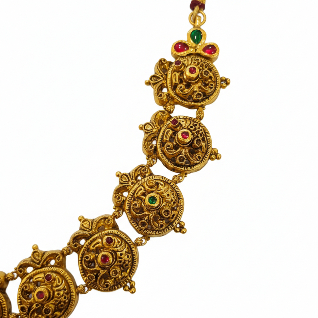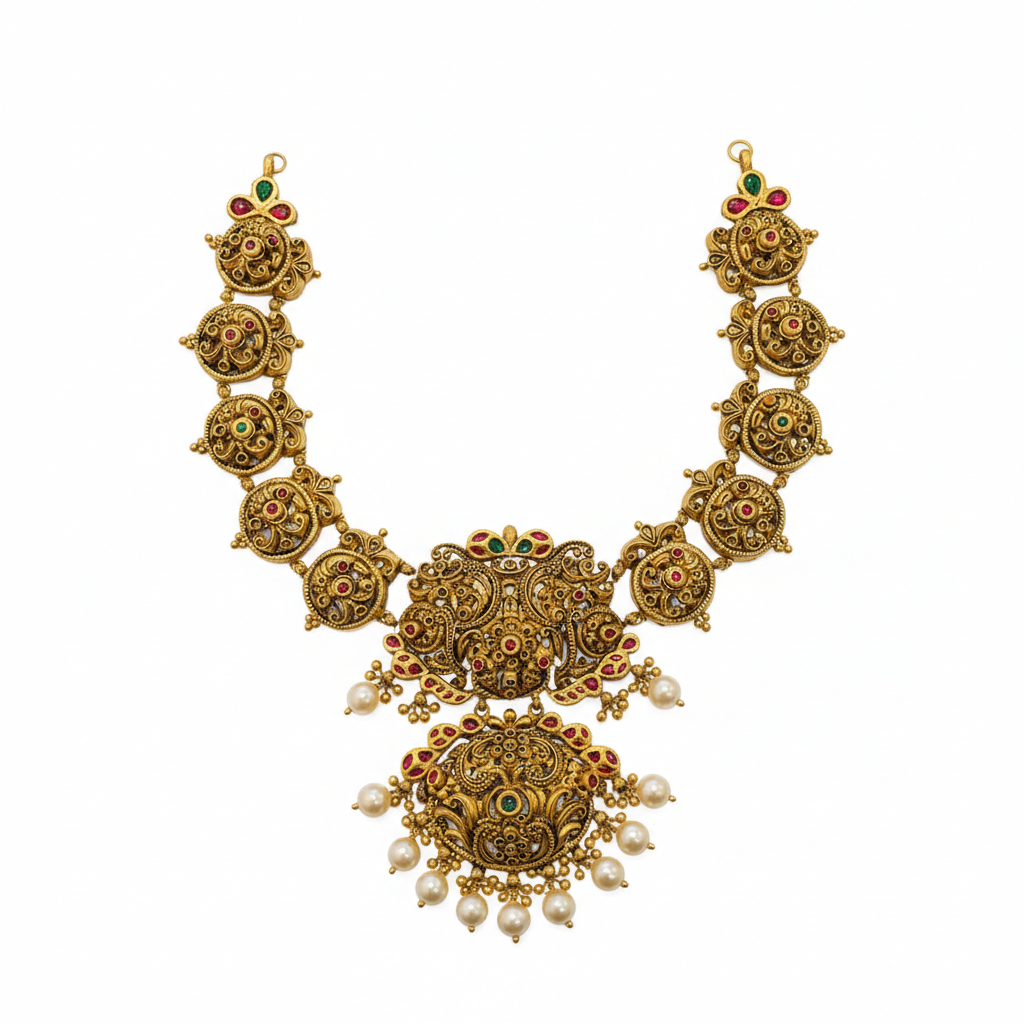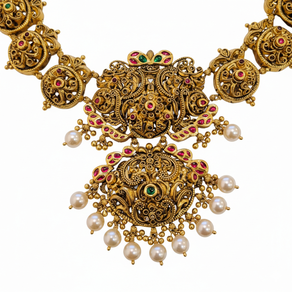 A beautiful antique gold temple necklace adorned with intricate traditional motifs and crimson-green stone accents. The bold pendant and soft pearl danglings add elegance and charm. Perfect for weddings and festive wear, it brings a graceful traditional touch to any outfit