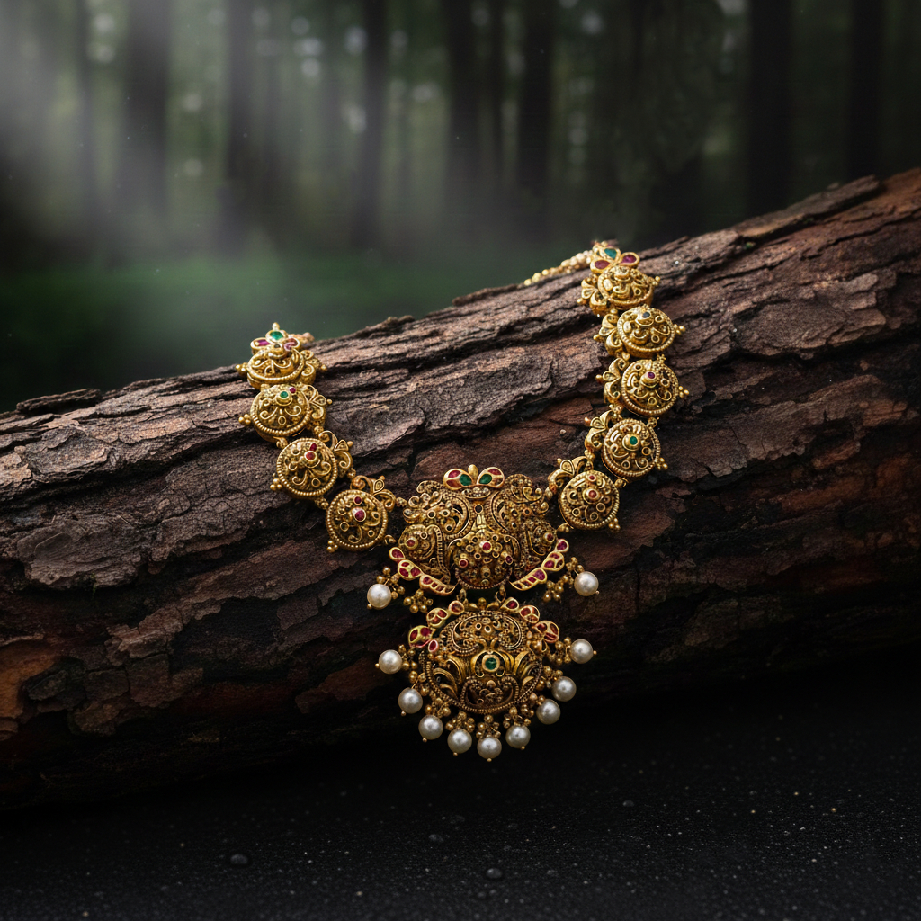 A beautiful antique gold temple necklace adorned with intricate traditional motifs and crimson-green stone accents. The bold pendant and soft pearl danglings add elegance and charm. Perfect for weddings and festive wear, it brings a graceful traditional touch to any outfit