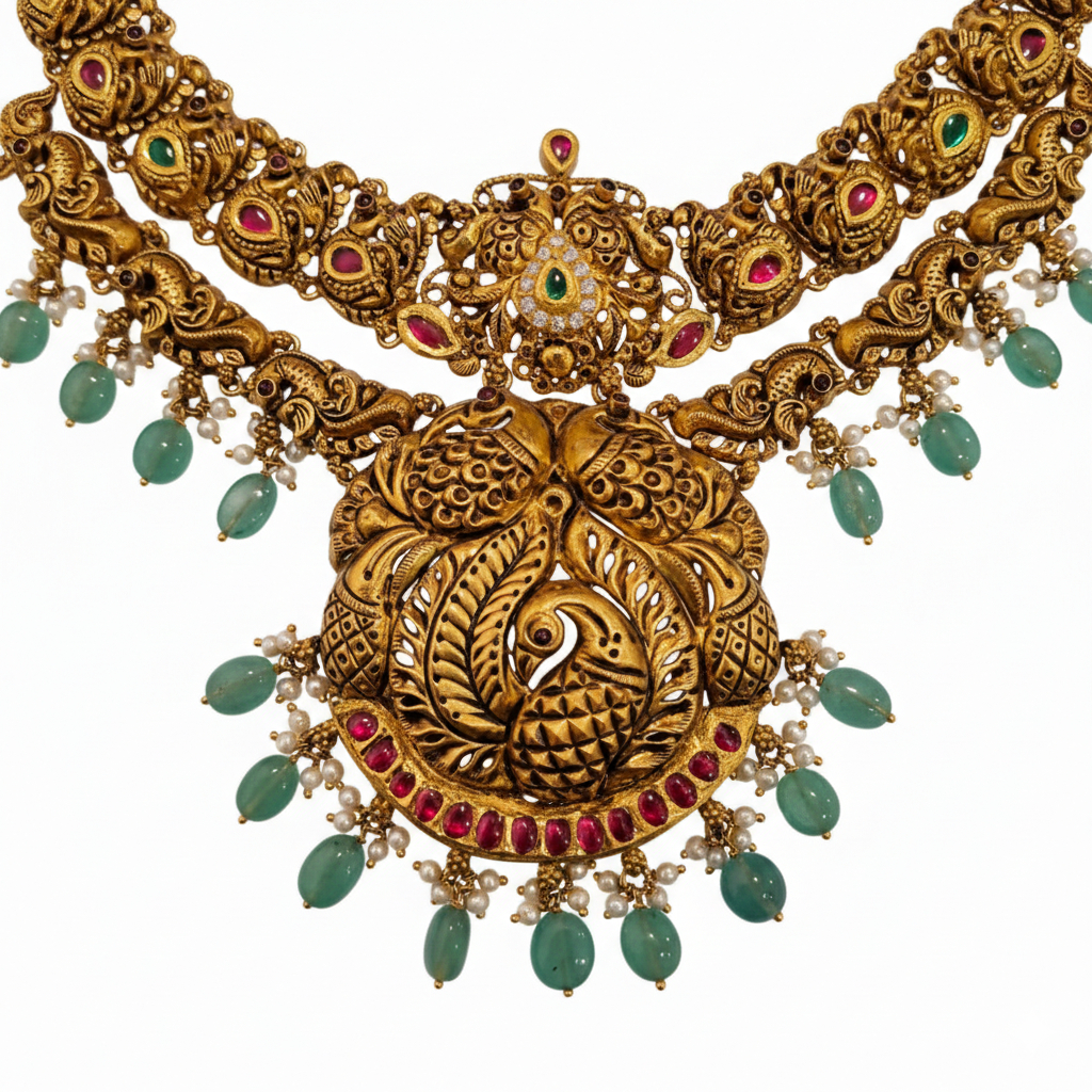 An exquisite antique-finish temple necklace featuring a majestic swan (Rajhans) motif surrounded by intricate carvings. Adorned with crimson-toned stones, delicate pearls, and elegant green bead drops, this statement piece reflects timeless South Indian craftsmanship and royal grace. 💛