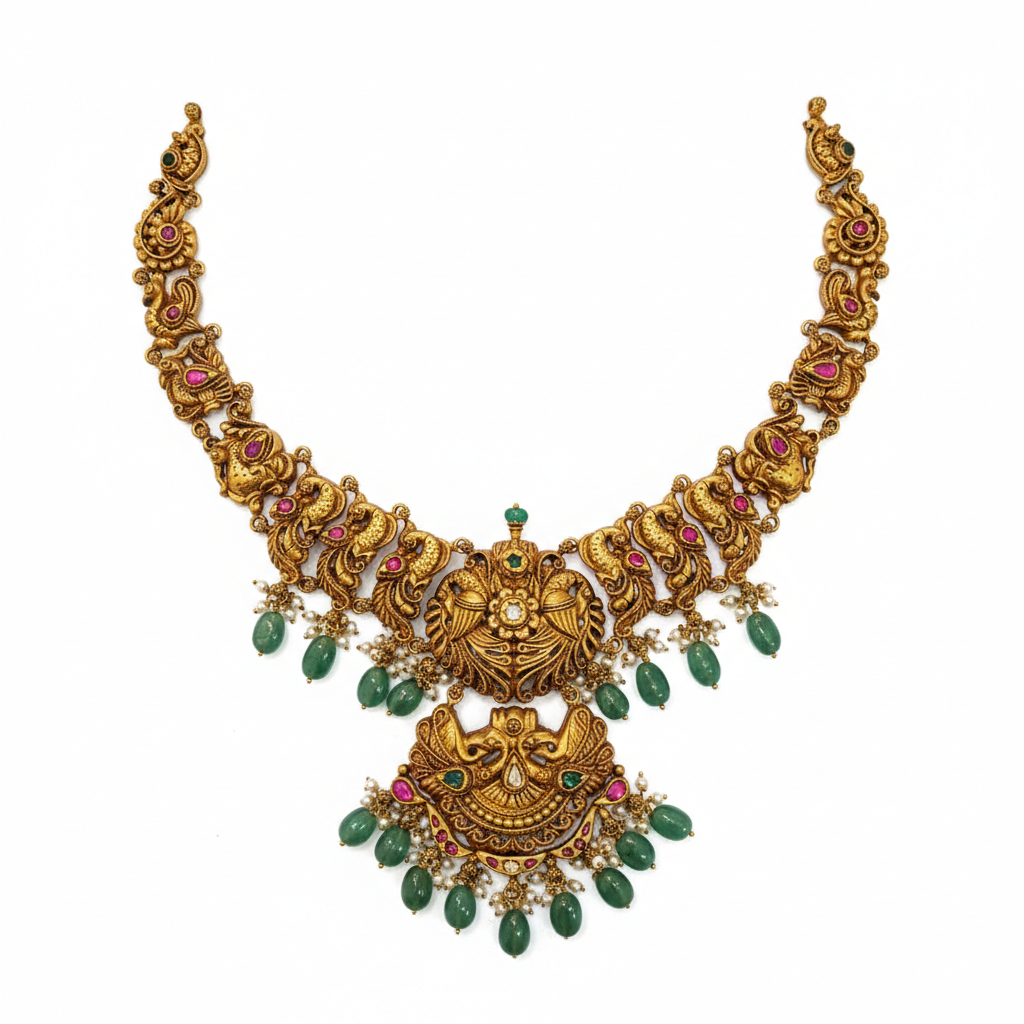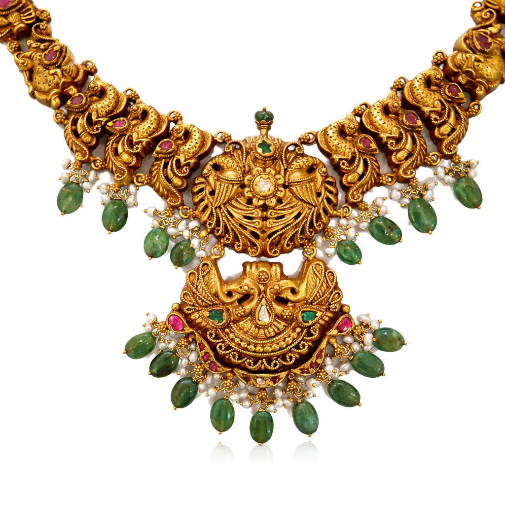 An exquisite temple-inspired gold necklace with intricate peacock motifs and divine detailing. Highlighted with vibrant green beads, crimson accents, and delicate pearl drops, this majestic piece reflects traditional craftsmanship and royal elegance—perfect for weddings and festive occasions.