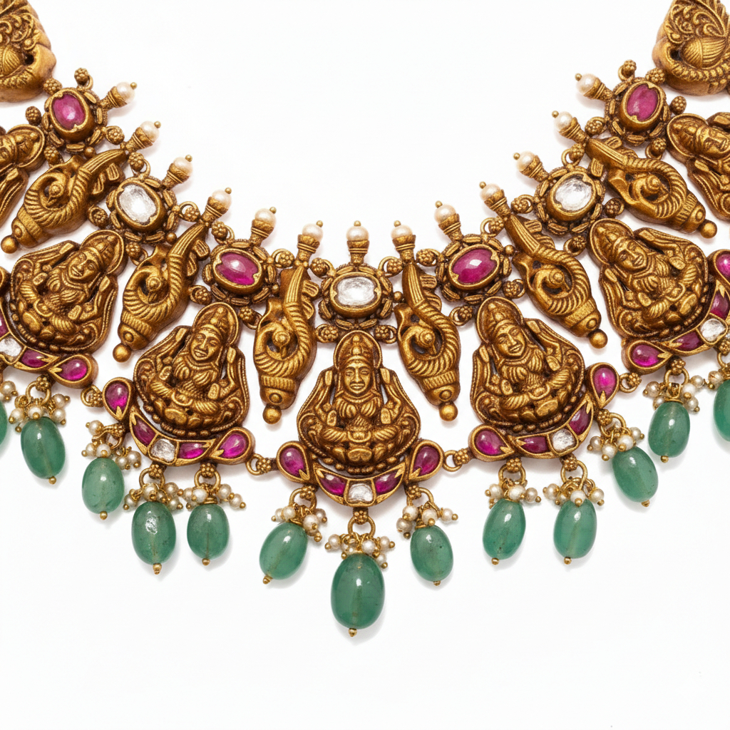 A magnificent temple-style gold necklace adorned with detailed Goddess Lakshmi motifs, crimson highlights, and graceful verdant drops. Rich antique craftsmanship and divine symbolism make it an ideal heirloom piece for weddings, festivals, and sacred occasions.