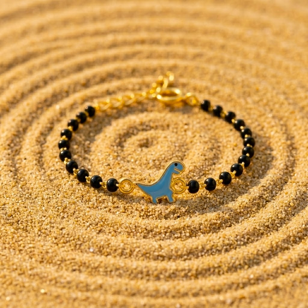 Adorably playful and full of tiny adventures, this baby bracelet features cute blue dinosaur charms at the center, beautifully balanced with sleek black beads along the chain. A perfect blend of fun and style, it adds a charming prehistoric touch to your little one’s everyday look.